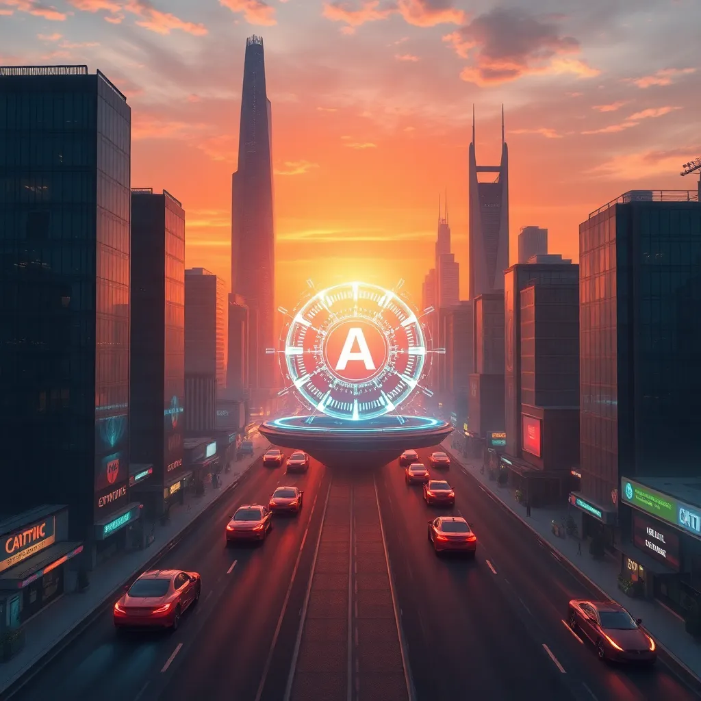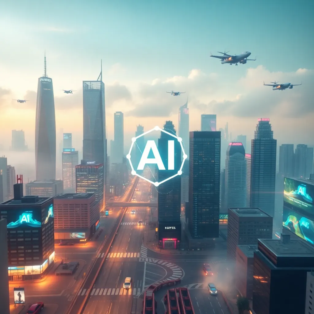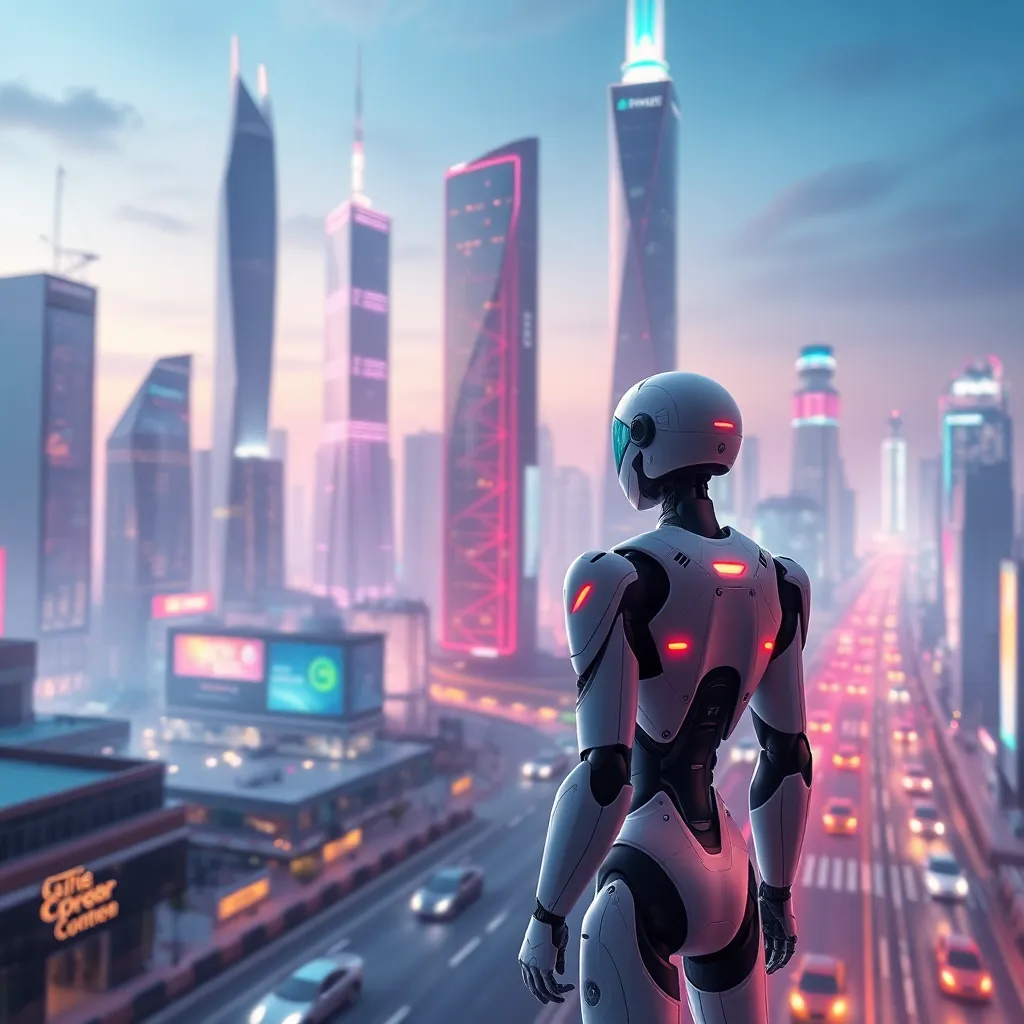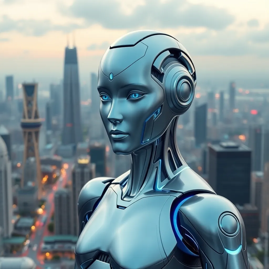 Imagine a futuristic cityscape with towering skyscrapers and a bustling metropolis. In the center, a humanoid AI robot stands tall, its metallic body glowing with a soft blue light. The robot's face is a seamless blend of human-like features and advanced technology, exuding confidence and innovation