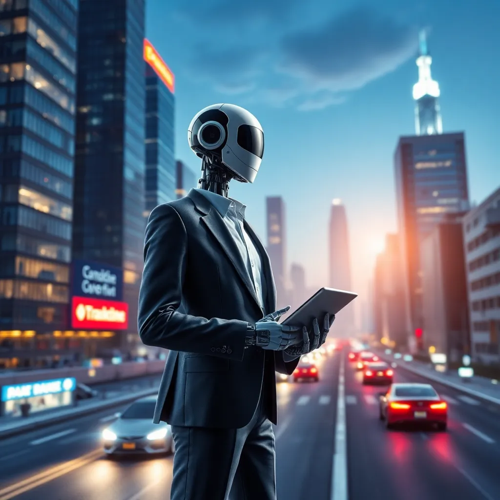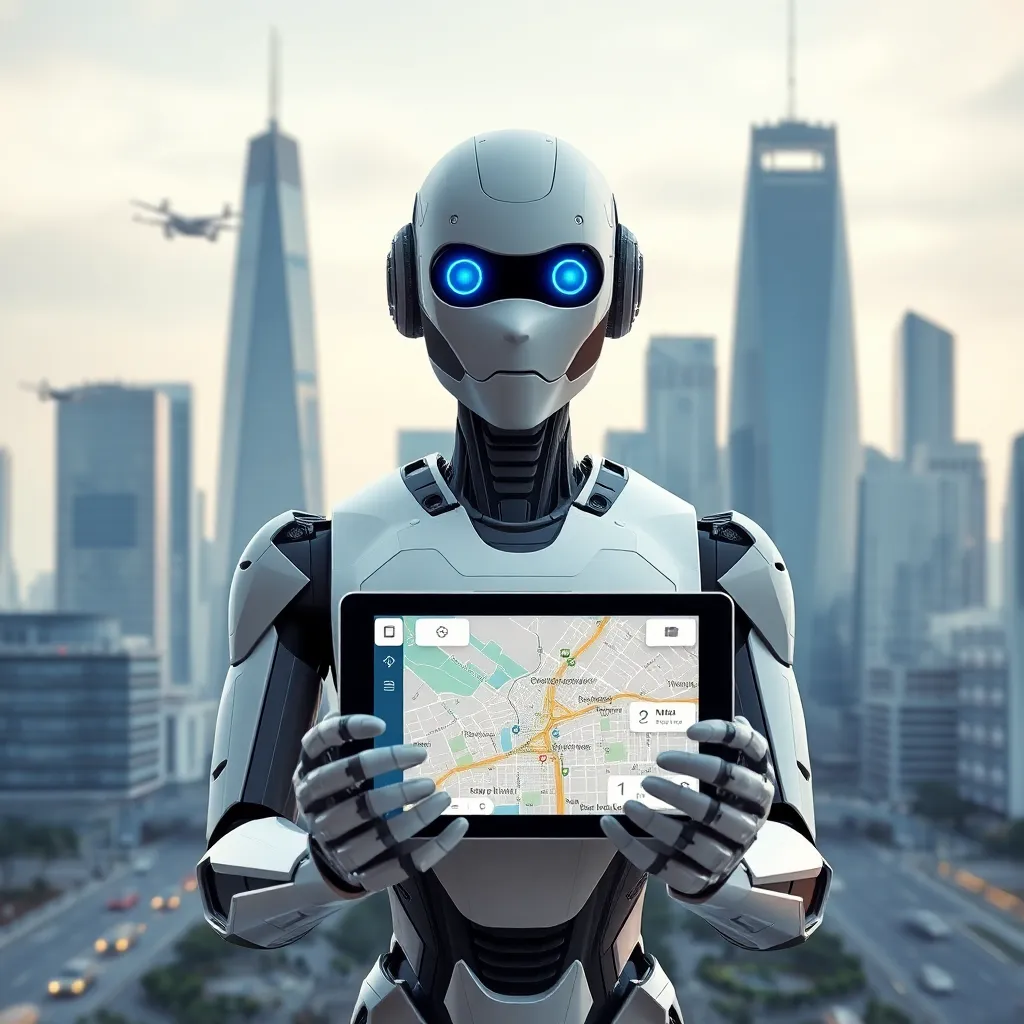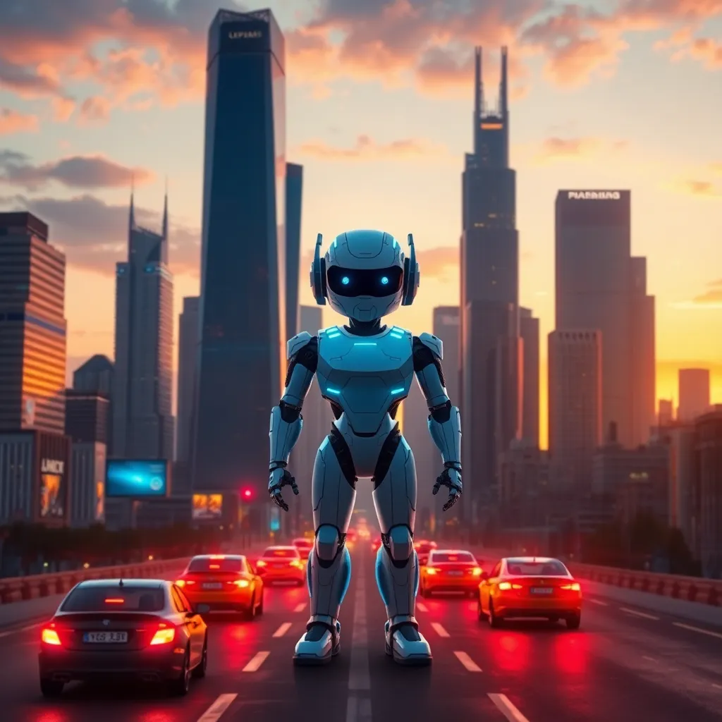 Imagine a futuristic cityscape with sleek skyscrapers and flying cars zipping by. In the center, a humanoid robot stands tall, its glowing blue eyes and metallic limbs a symbol of innovation and progress. The robot's hands hold a tablet, displaying a city map with AI-generated routes and traffic updates.