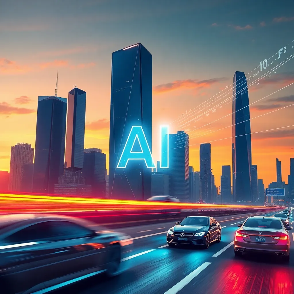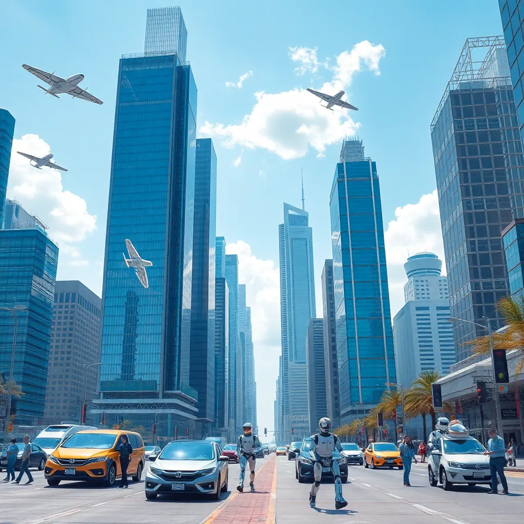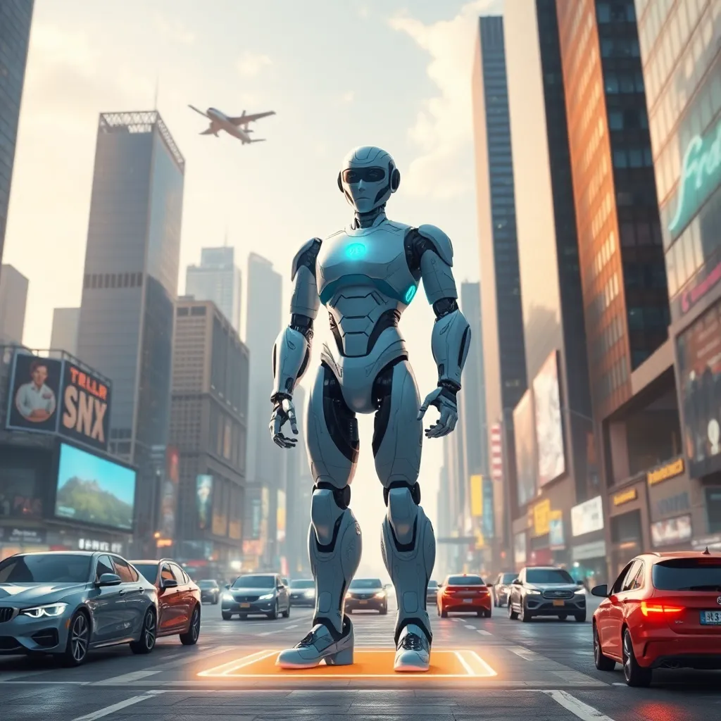 Imagine a futuristic cityscape with sleek skyscrapers and flying cars zipping by. In the center, a humanoid robot stands tall, its glowing blue eyes and metallic limbs a symbol of innovation and progress. The robot's hands hold a tablet, displaying a city map with AI-generated routes and traffic updates.