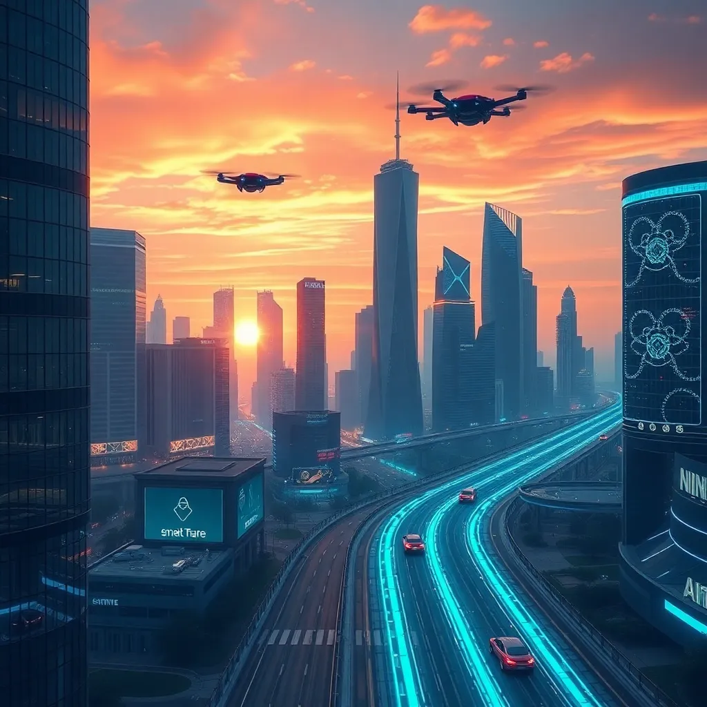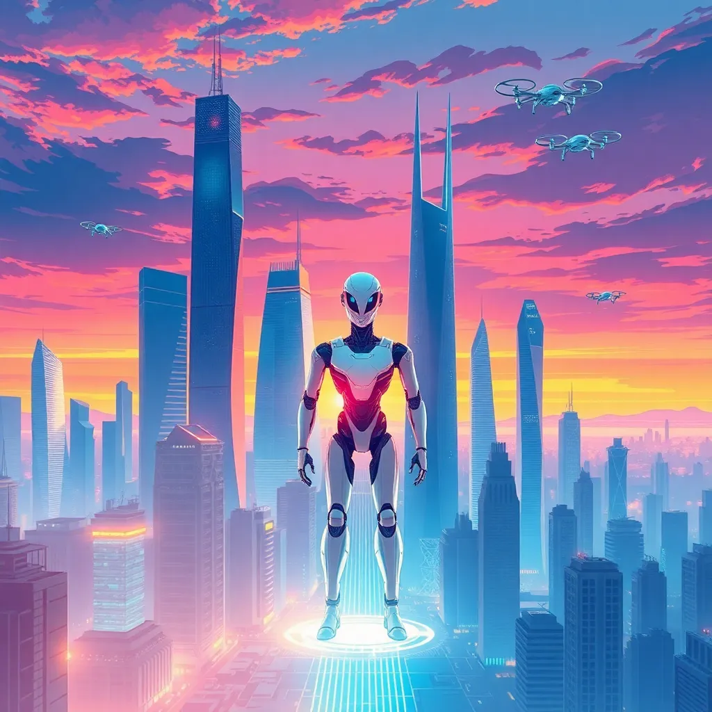 Create an illustration of a futuristic cityscape at sunset, with towering skyscrapers and sleek architecture. Incorporate a prominent AI-powered robot standing at the city's center, surrounded by holographic projections and flying drones. The atmosphere should be vibrant and energetic, with a sense of innovation and progress.