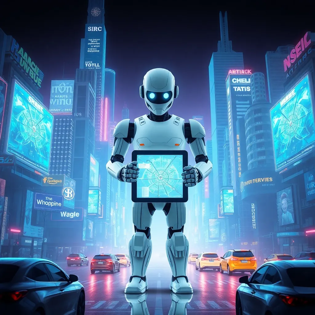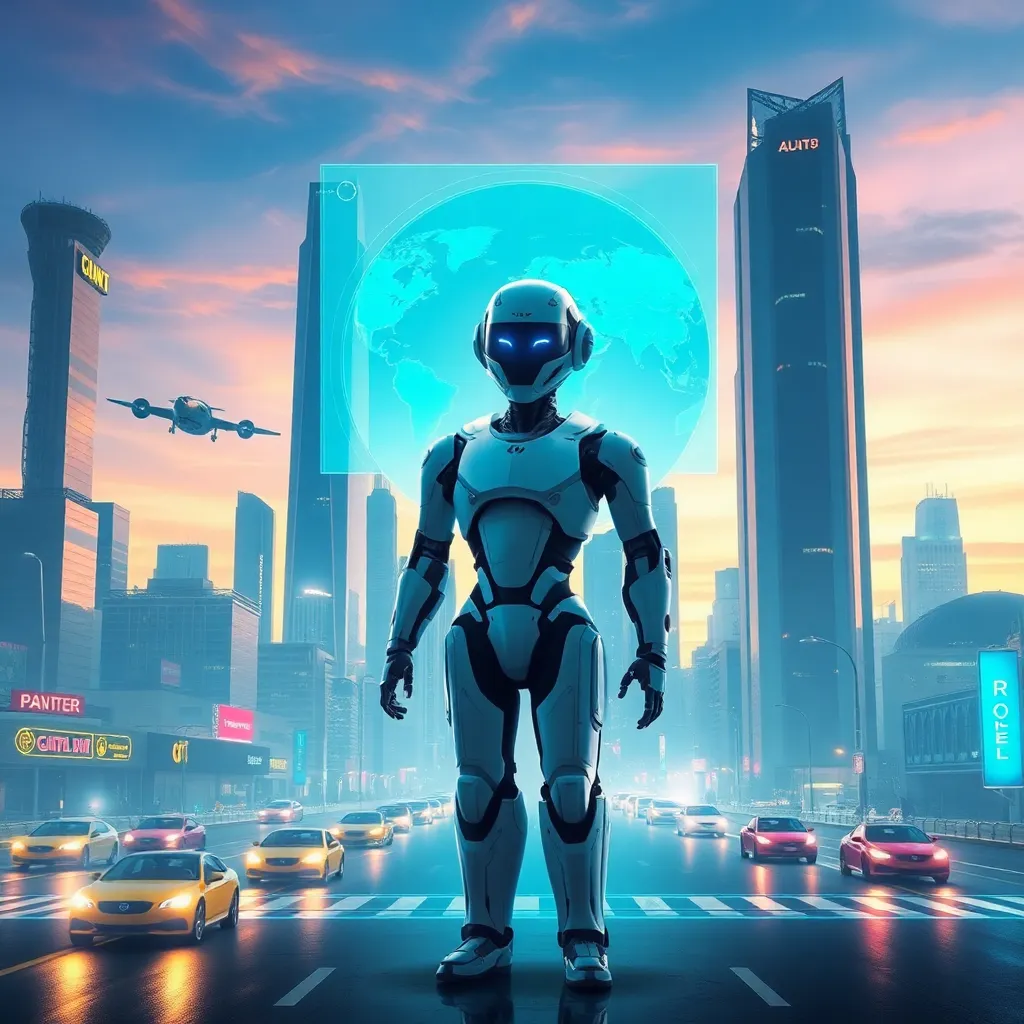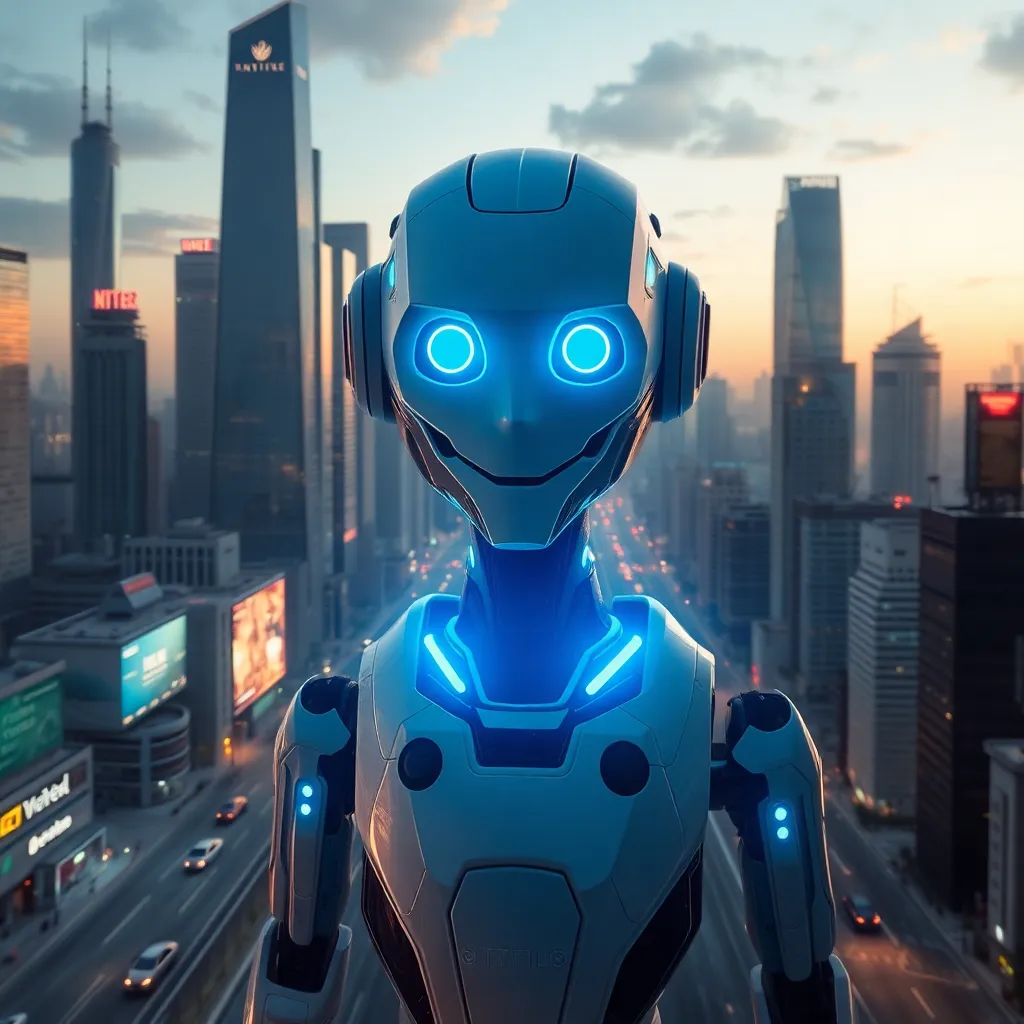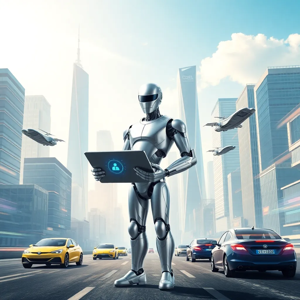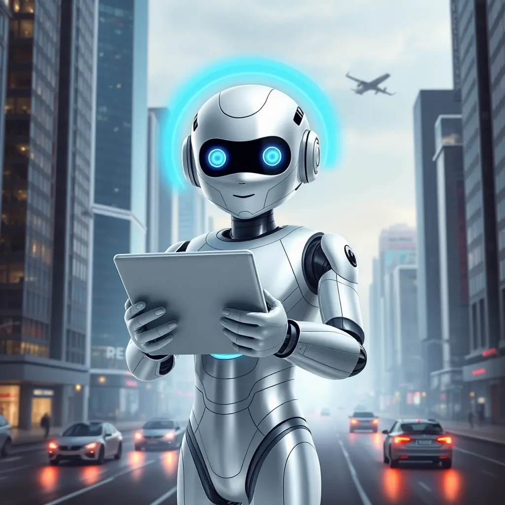 Imagine a futuristic cityscape with towering skyscrapers and flying cars zipping by. In the center, a humanoid robot with glowing blue eyes and a sleek metallic body stands proudly, holding a tablet with a holographic display. The robot is surrounded by a halo of soft blue light, symbolizing innovation and progress.