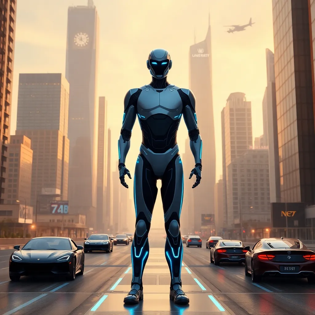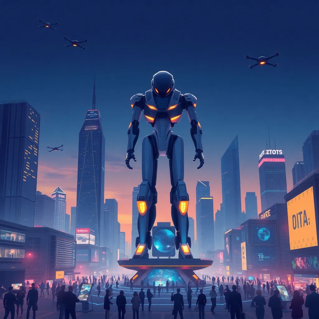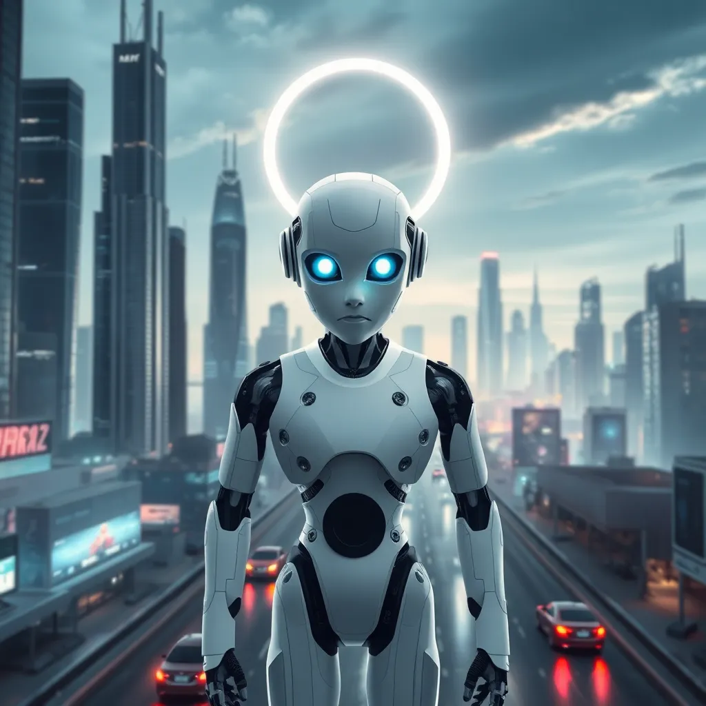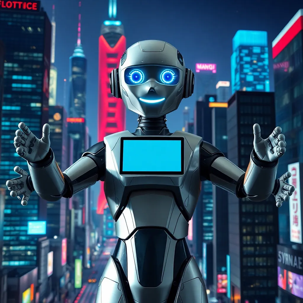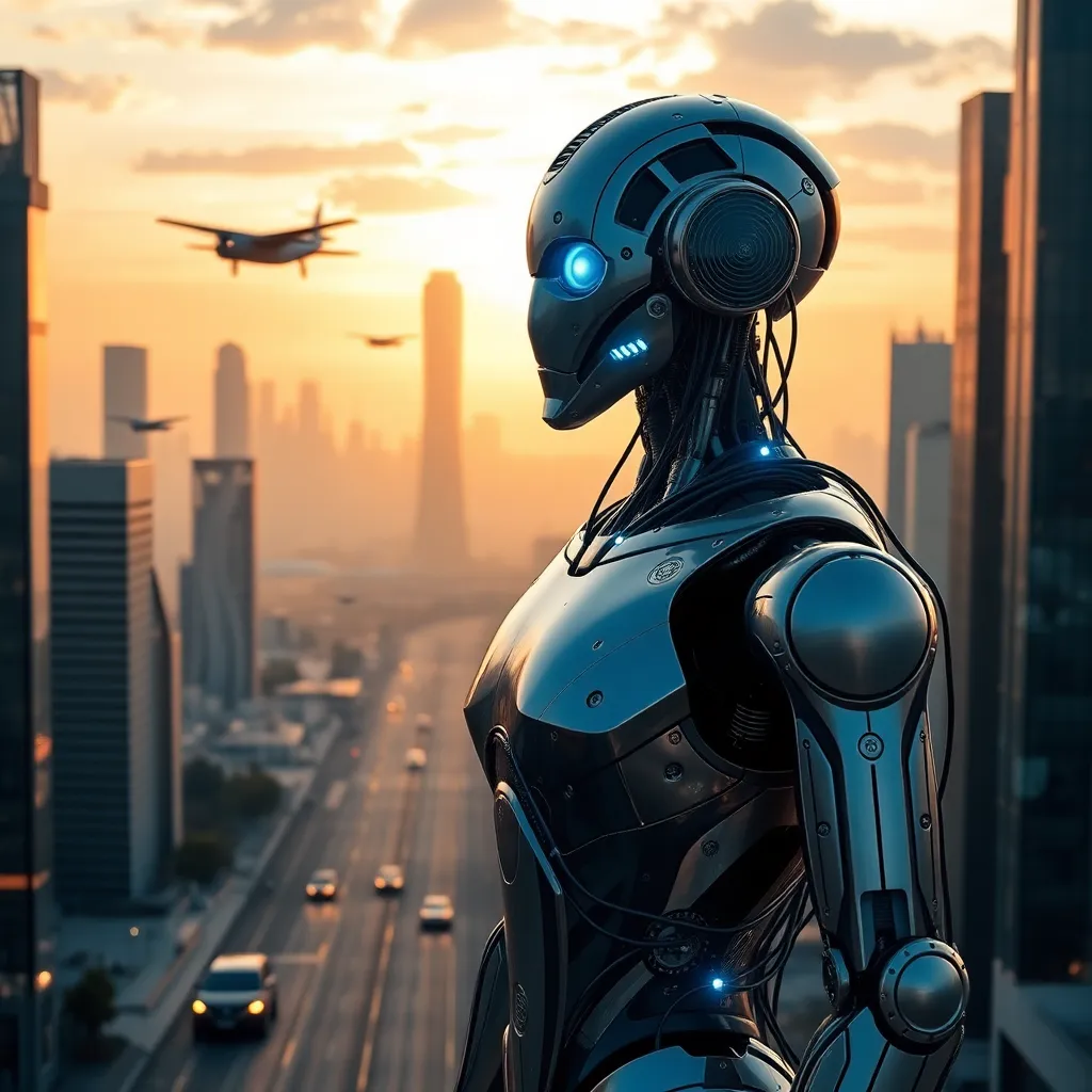 Imagine a futuristic cityscape with towering skyscrapers and flying cars zipping by. In the center, a humanoid robot with glowing blue eyes and a sleek metallic body stands proudly, holding a tablet with a holographic display. The robot is surrounded by a halo of soft blue light, symbolizing innovation and progress.