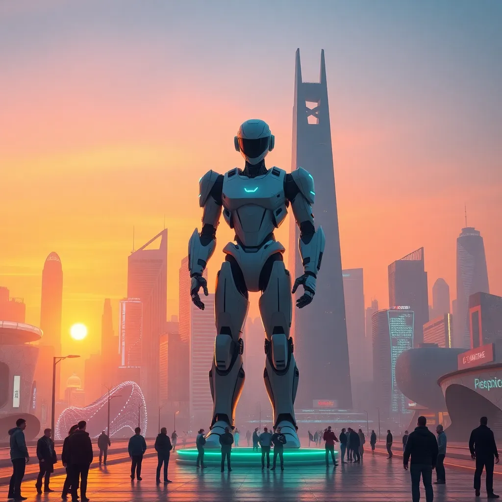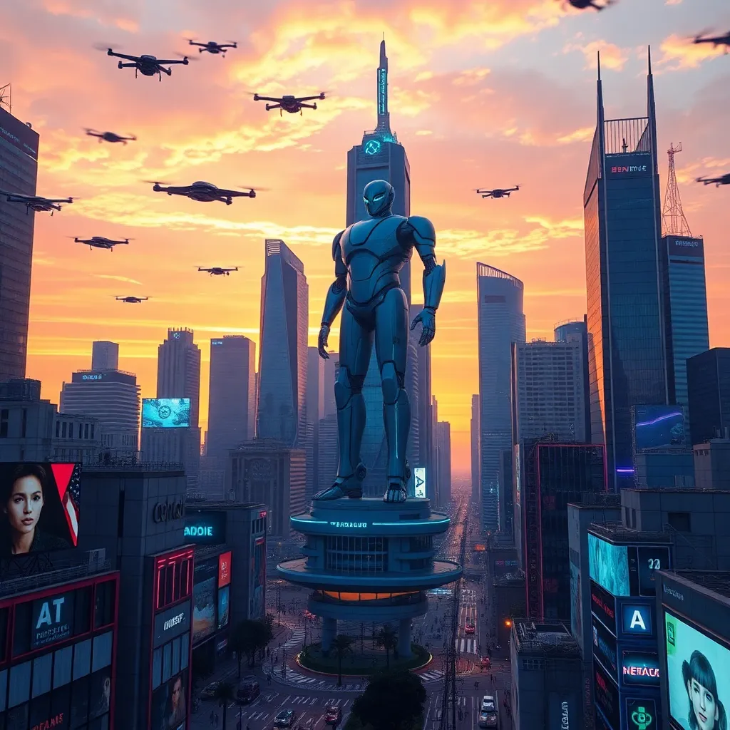 Create an image of a futuristic cityscape at sunset, with sleek skyscrapers and hovering drones, surrounded by a vibrant atmosphere with holographic advertisements and a subtle glow of AI-powered streetlights. The city's main landmark, a towering robot statue, stands tall and proud, symbolizing innovation and technological advancement.