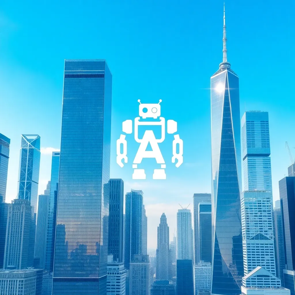 Create an AI-generated image of a futuristic cityscape with towering skyscrapers and a bright blue sky. Incorporate a prominent AI logo or symbol, such as a robotic figure or a circuit board, prominently displayed in the foreground or on a building's facade. The image should exude a sense of innovation and progress.