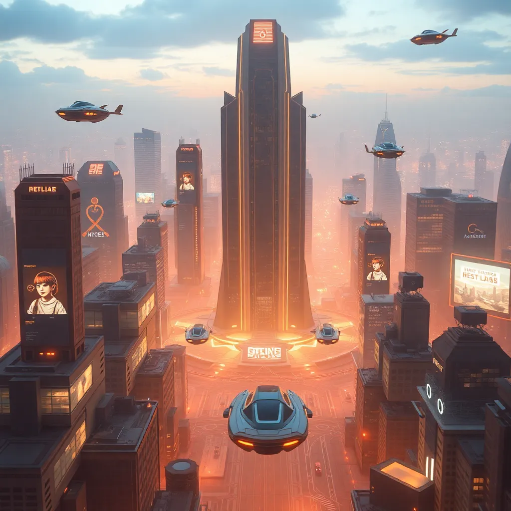 Create an image of a futuristic cityscape with a large, gleaming skyscraper in the center, surrounded by flying cars and robots. The city should be bathed in a warm, golden light, with a subtle futuristic glow emanating from the buildings. Incorporate AI-generated elements such as holographic advertisements and levitating transportation pods.