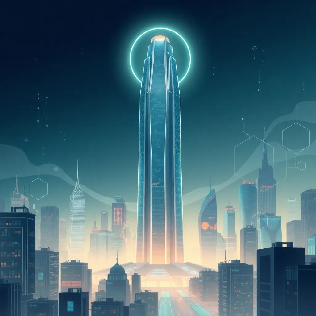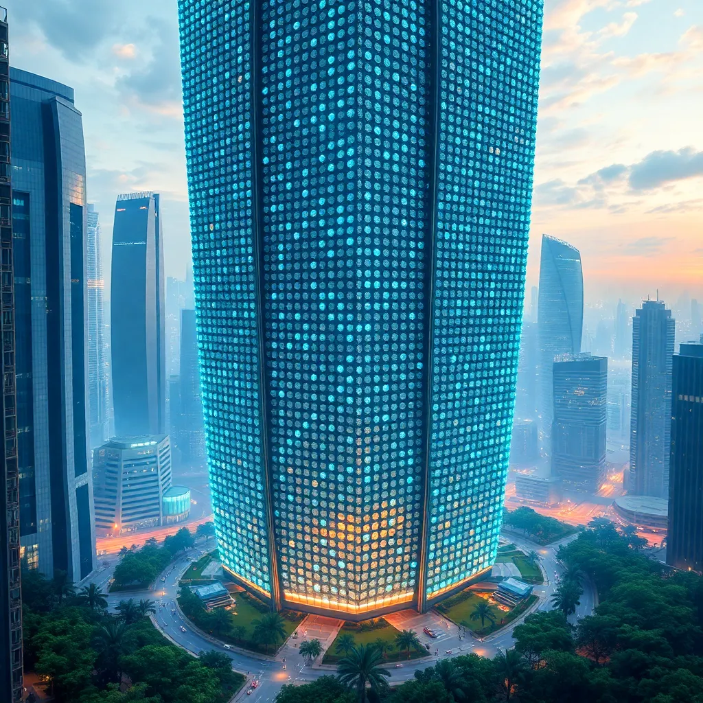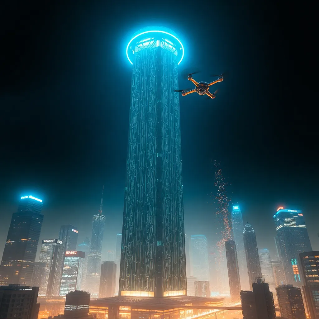 Imagine a futuristic cityscape with a towering skyscraper in the center, surrounded by a halo of soft blue light. The building's facade is covered in intricate circuitry patterns, and a small drone flies nearby, emitting a trail of tiny sparks. The atmosphere is electric and vibrant, with a sense of innovation and progress.