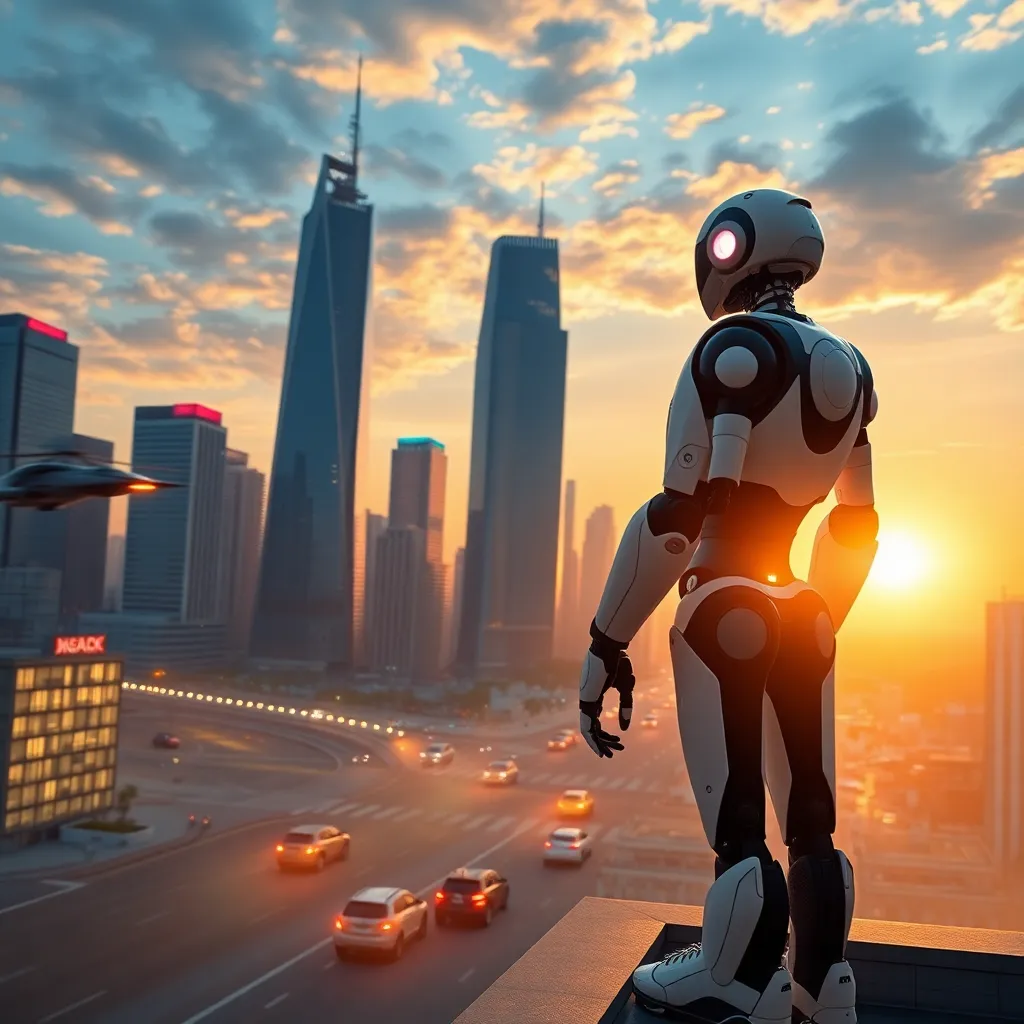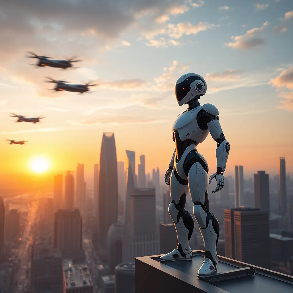 Create an image of a futuristic cityscape at sunrise, with towering skyscrapers and flying cars zipping by. Incorporate a prominent AI-powered robot standing on the rooftop of a skyscraper, overlooking the city with a confident and futuristic expression. The image should convey a sense of innovation and progress.