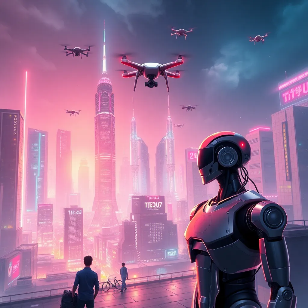 Create an image of a futuristic cityscape with towering skyscrapers and flying cars zipping by. The city should be bustling with people, robots, and AI-powered drones. Incorporate vibrant colors and neon lights to give the image a futuristic and high-tech feel. The image should be visually striking and convey a sense of innovation and progress.
