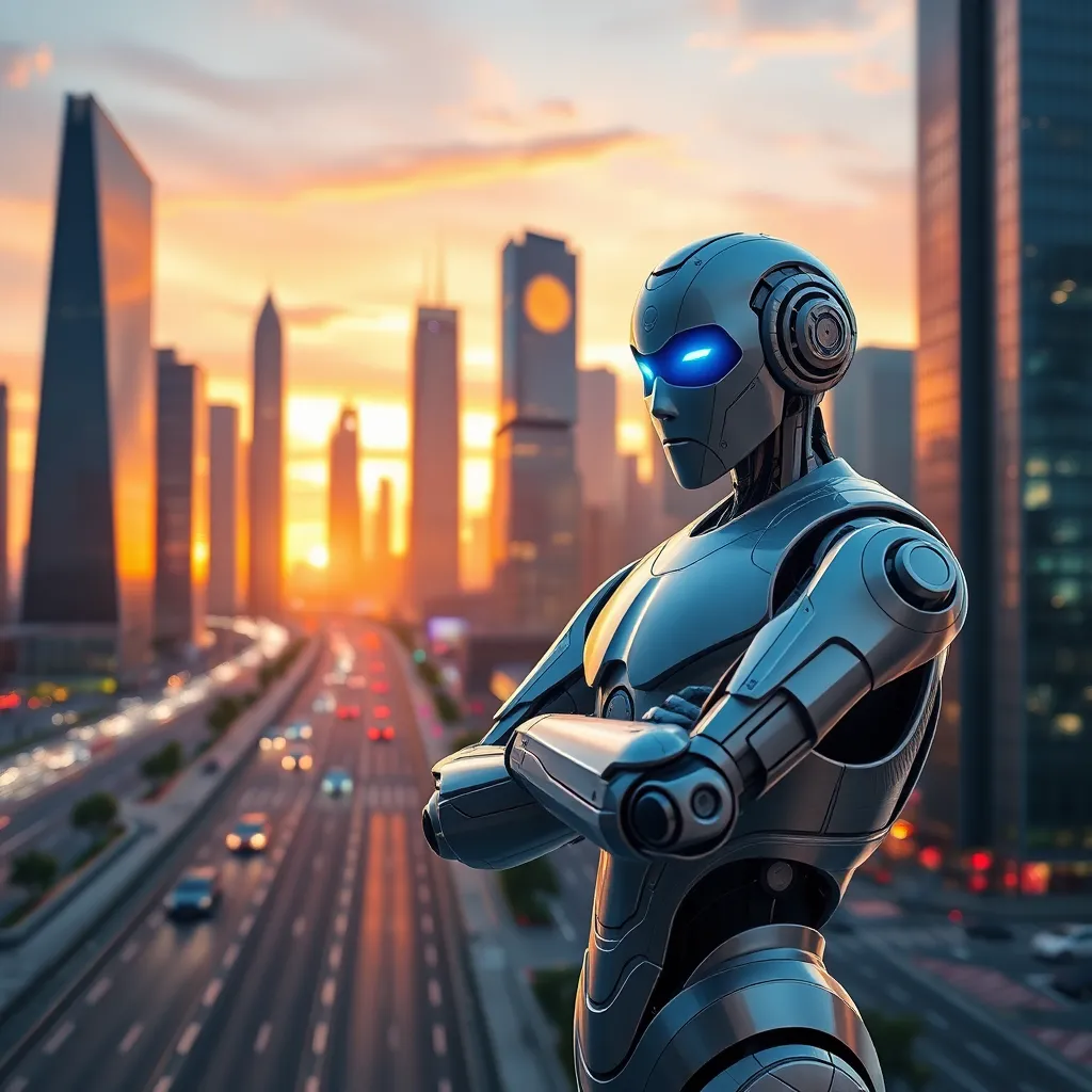 Imagine a futuristic cityscape at sunset, with sleek skyscrapers and flying cars zipping by. In the foreground, a humanoid AI robot with glowing blue eyes and a silver exoskeleton stands confidently, its arms crossed, representing innovation and technological advancement. The city's bright lights and vibrant colors reflect its dynamic energy.