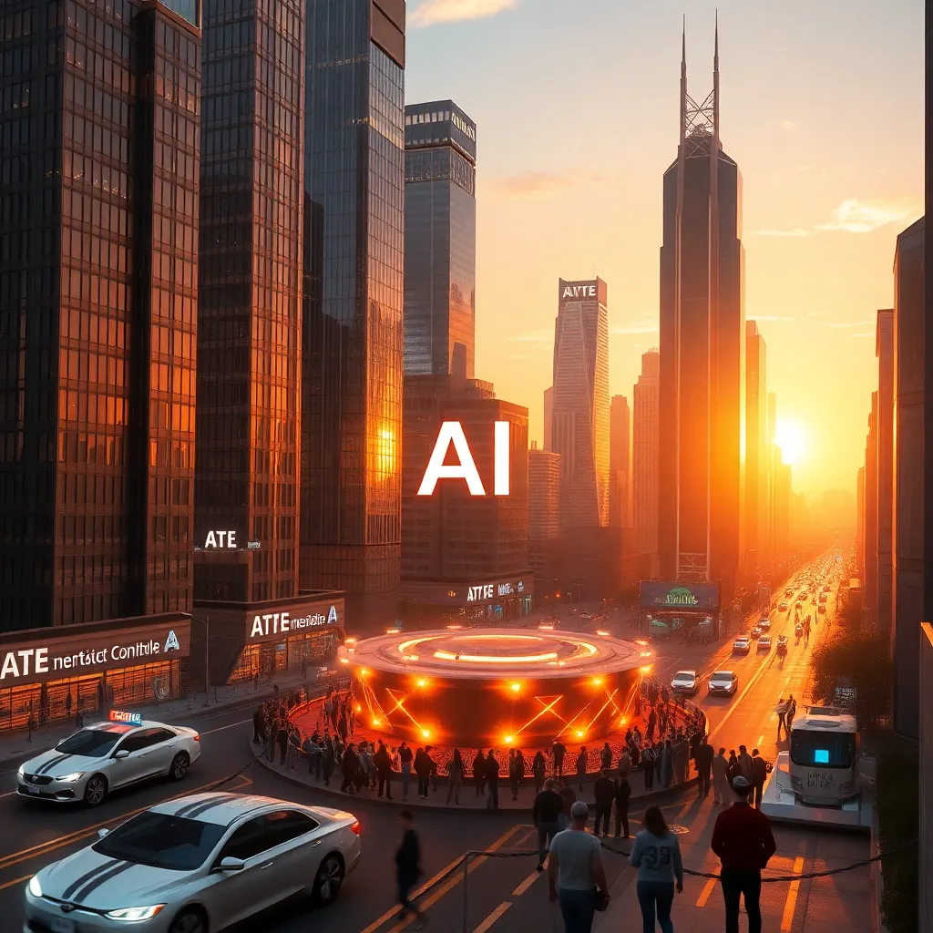 Create an image of a futuristic cityscape at sunset, with towering skyscrapers and flying cars zipping by. Incorporate a central hub with a large, glowing AI logo and a group of people gathered around, marveling at the technological advancements. The atmosphere should be vibrant and optimistic, with a warm golden glow.