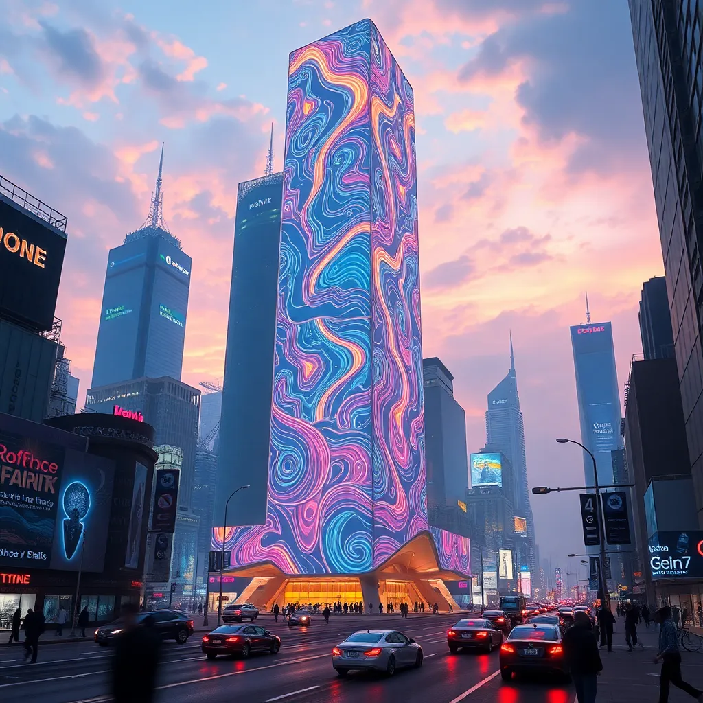 Imagine a futuristic cityscape with a glowing, neon-lit skyscraper in the center. The building's exterior is covered in intricate, swirling patterns that shift and change color as people walk by. The city streets are bustling with flying cars and pedestrians, with a sense of excitement and innovation in the air.