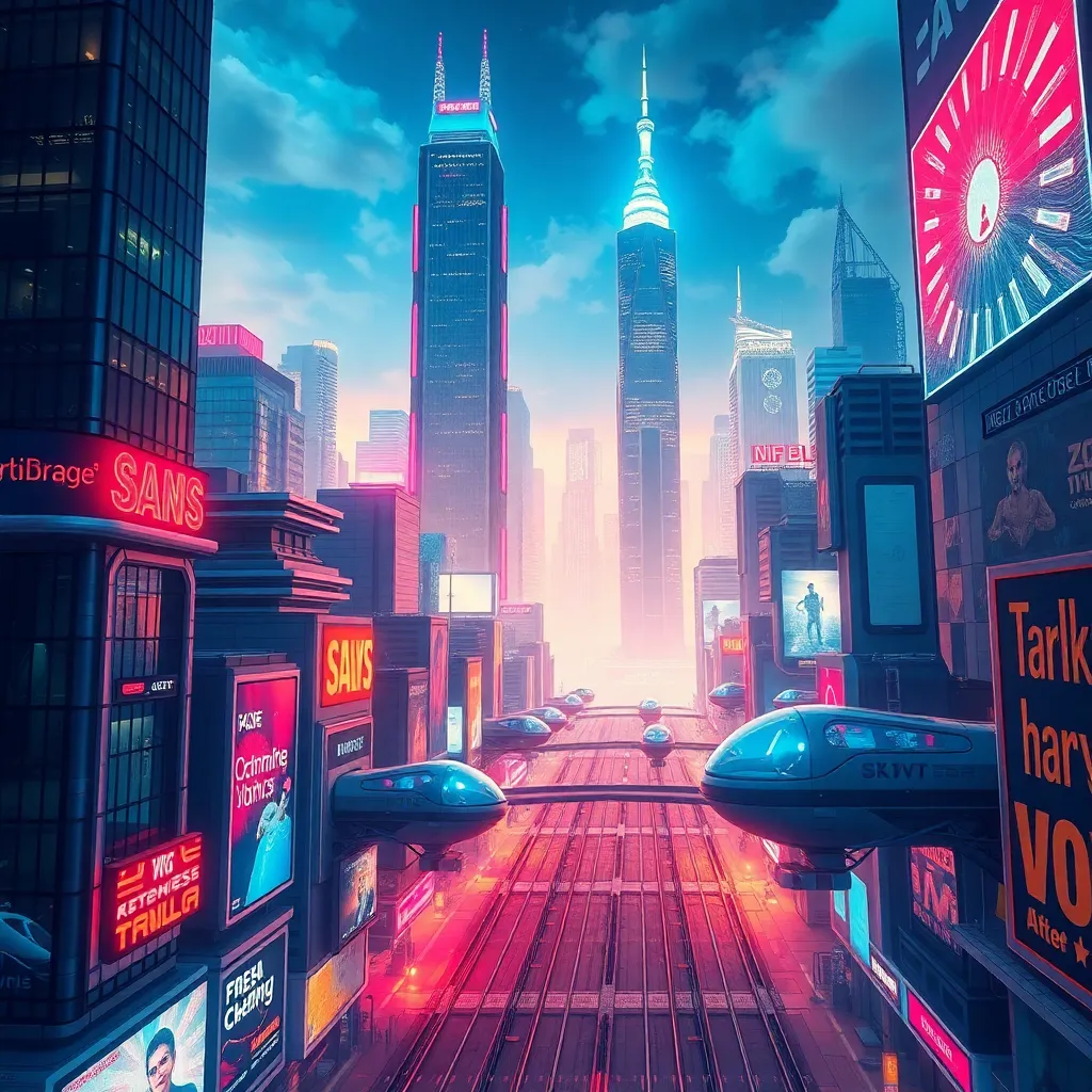 Create an image of a futuristic cityscape with towering skyscrapers, sleek transportation pods, and a vibrant atmosphere. Incorporate glowing neon lights, holographic advertisements, and a prominent city skyline. The image should exude a sense of innovation, technology, and progress. Use a bold color palette and striking visuals.
