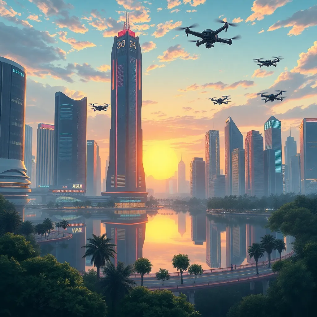 Create an illustration of a futuristic cityscape at sunset, with towering skyscrapers and neon lights reflecting off a serene lake. Incorporate AI-powered robots and drones flying through the air, surrounded by lush greenery and a vibrant city life. The image should exude a sense of innovation and technological advancement.