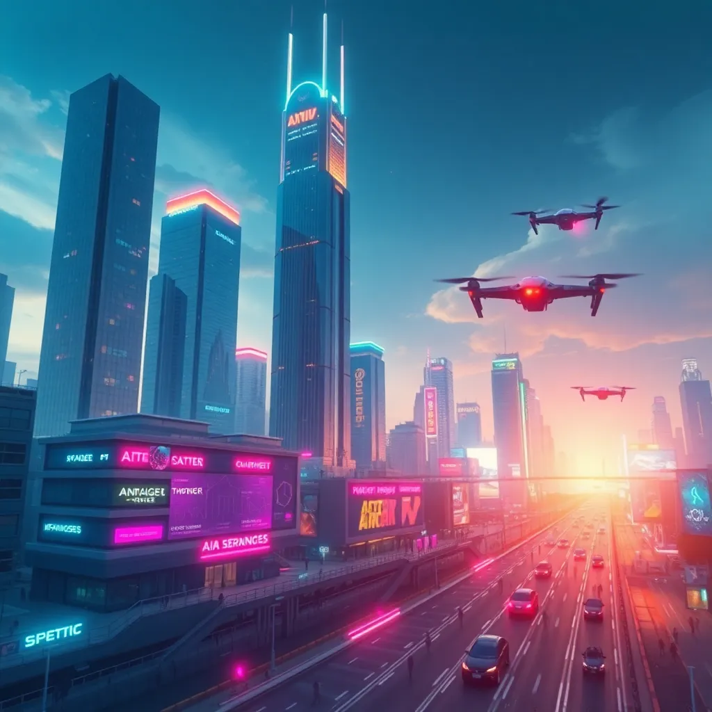 Create an image of a futuristic cityscape with towering skyscrapers and flying cars zipping by. Incorporate a prominent AI-powered robot standing at the city's center, surrounded by holographic advertisements and neon lights. The atmosphere should be vibrant and futuristic, conveying a sense of innovation and technological advancement.