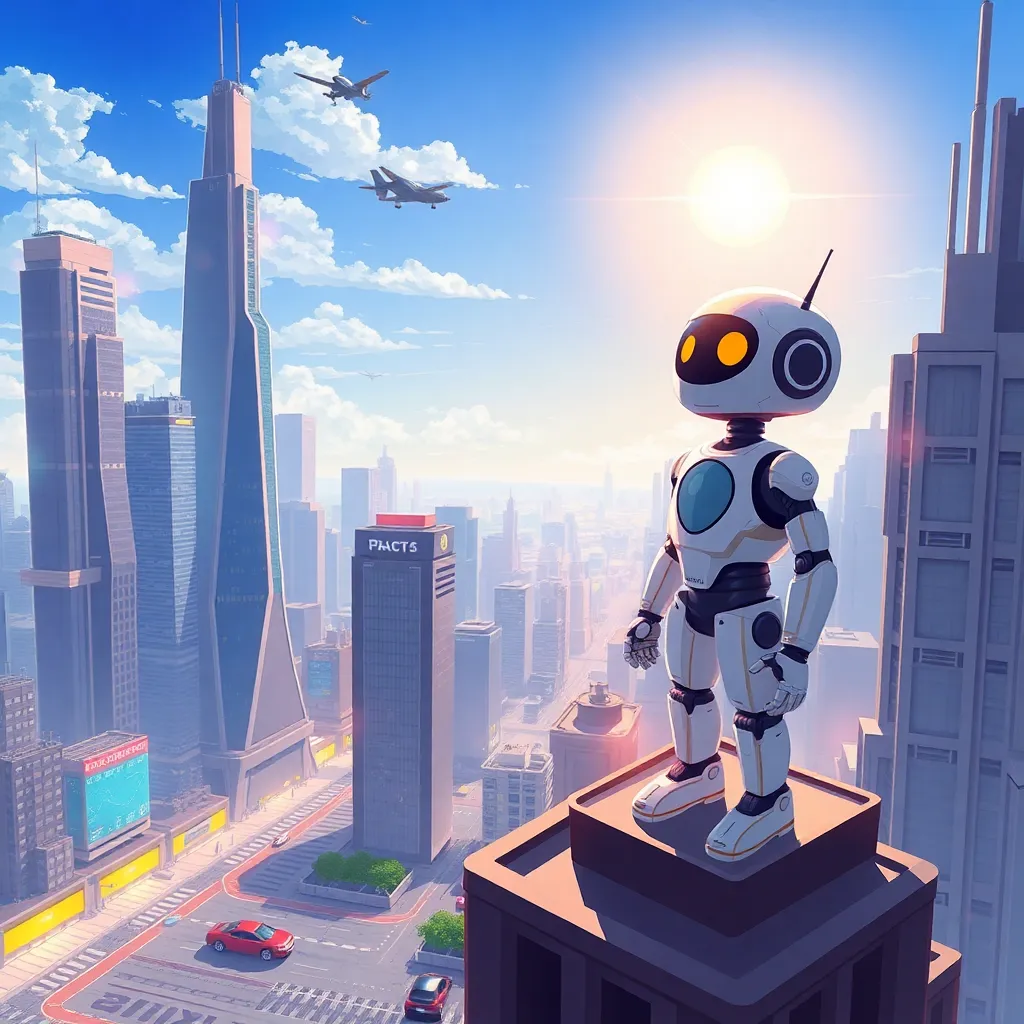 Create an illustration of a futuristic cityscape with towering skyscrapers, flying cars, and a bright blue sky. Incorporate a humanoid robot standing on the rooftop of the tallest building, gazing out at the city with a warm, welcoming smile. The robot should be surrounded by a halo of soft, pulsing light.