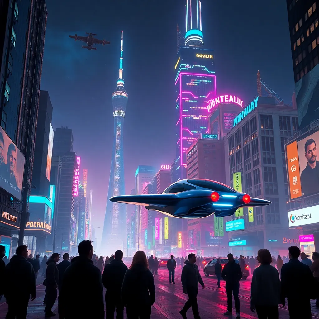 Imagine a futuristic cityscape with a towering skyscraper in the background, a sleek flying car hovering above the street, and a group of people in the foreground, all surrounded by a vibrant, neon-lit atmosphere. The city is bustling with activity, showcasing humanity's advancements in technology and innovation.