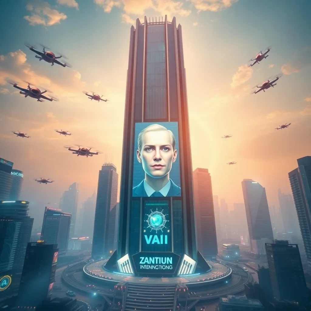 Create an image of a futuristic cityscape with a towering skyscraper in the center, surrounded by flying cars and drones. The building's facade should feature a large digital display screen with a robotic AI spokesperson's face, conveying a sense of innovation and progress. The atmosphere should be vibrant and dynamic.