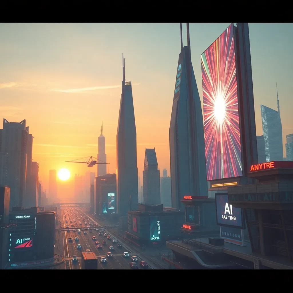Create an image of a futuristic cityscape at sunset, with towering skyscrapers and sleek architecture. The city is bustling with flying cars and robots, while a massive AI-powered screen displays a vibrant, pulsing light show. Incorporate a sense of excitement and innovation, with a hint of nostalgia for the past.