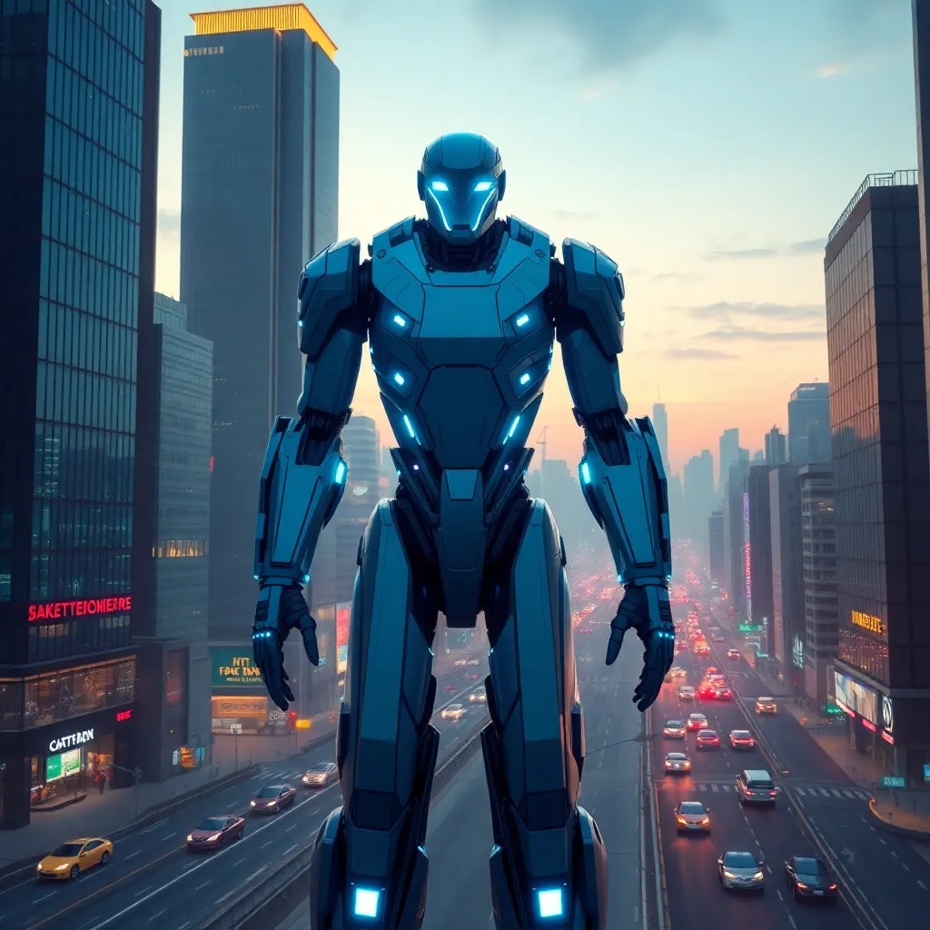 Imagine a futuristic cityscape with sleek skyscrapers and flying cars zipping by. In the center, a large AI-powered robot stands tall, its glowing blue eyes scanning the horizon. The robot's metallic body is adorned with intricate circuits and wires, emitting a soft blue light. The city's skyline is bathed in a warm, golden glow.