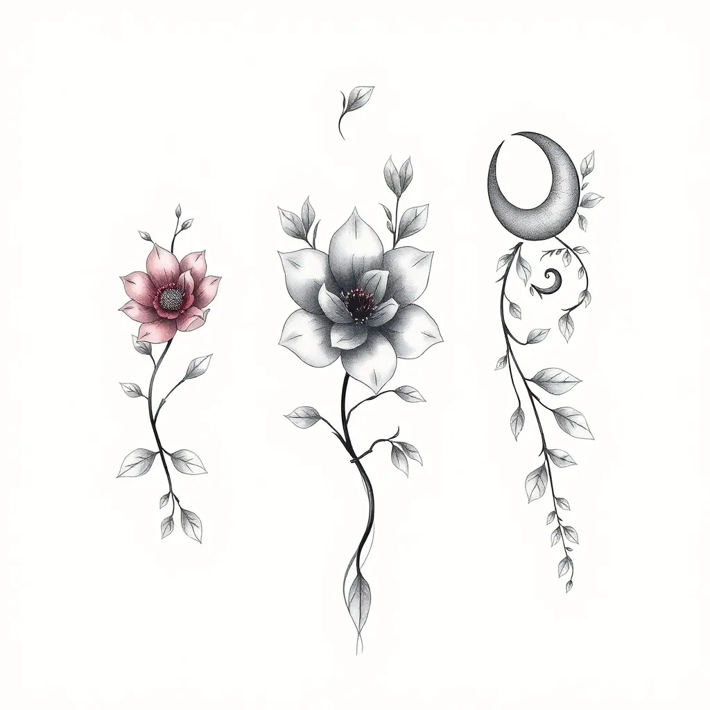 Create a stunning tattoo design for a nature-inspired sleeve. Combine elements of a blooming flower, intertwining vines, and a crescent moon in a whimsical, dreamlike style. Incorporate subtle shading and texture to give the design depth and dimension. The final image should evoke a sense of serenity and wonder.