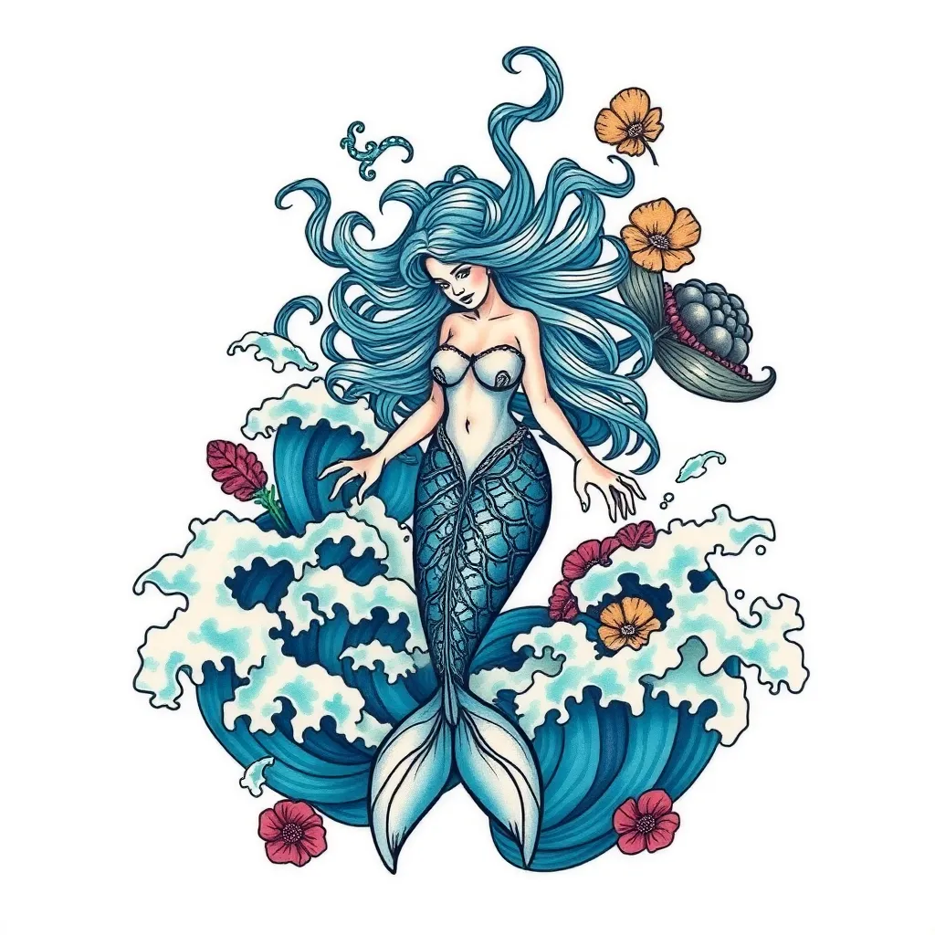 Create a stunning tattoo design for a young woman who loves the ocean. Incorporate a majestic mermaid, surrounded by seaweed and ocean waves, with a subtle glow effect. The mermaid should be depicted in a pose that exudes confidence and freedom. Use a mix of blues and greens to evoke a sense of serenity.