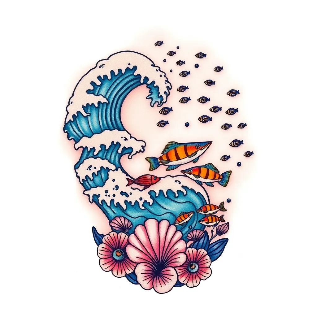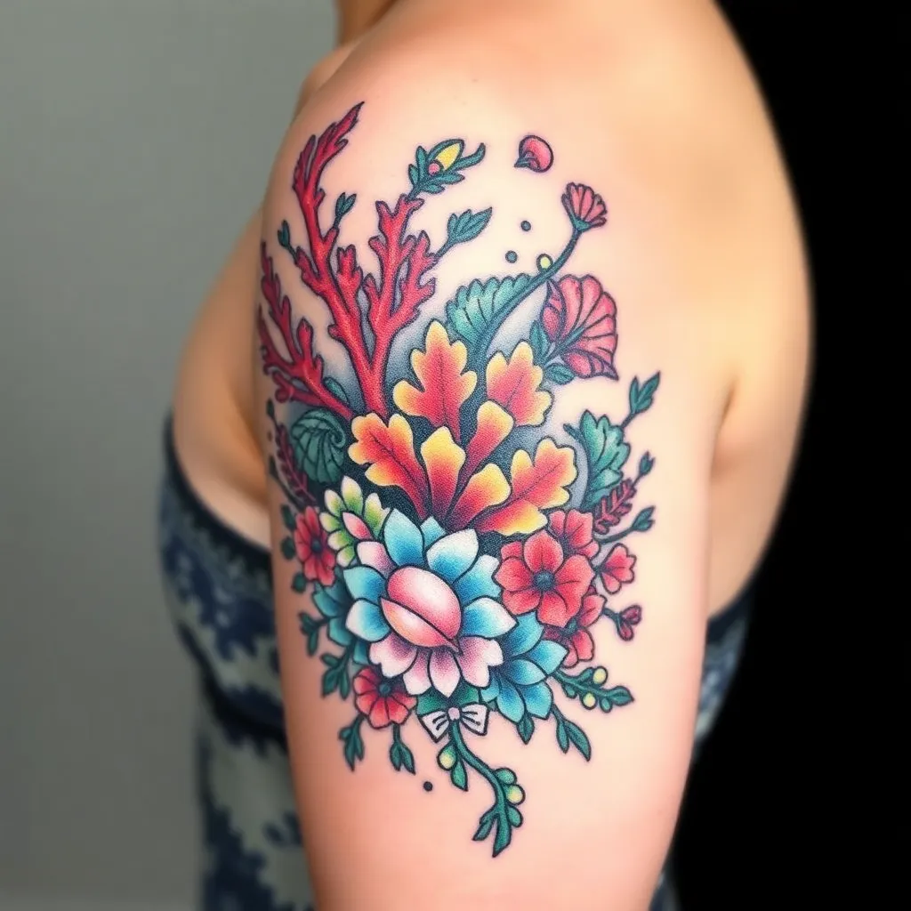 Create a unique, intricate, and colorful tattoo design inspired by the beauty of the ocean. Incorporate elements of coral, seaweed, and shells. The design should be bold and striking, with a mix of geometric and organic patterns. The tattoo should be suitable for placement on the upper arm or shoulder.