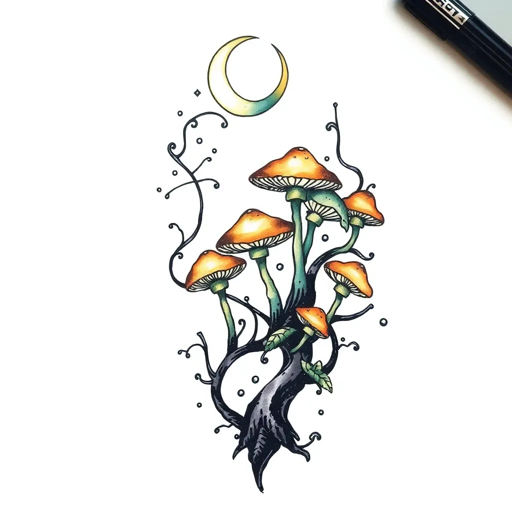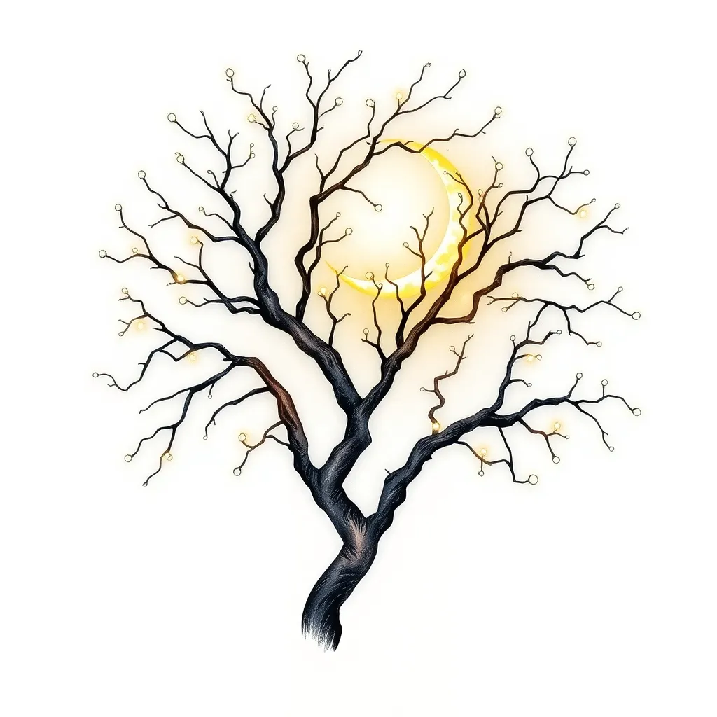Create a stunning tattoo design inspired by the mystical forest of Whimsy Woods. Incorporate intricate tree branches, sparkling fireflies, and a crescent moon glowing in the background. The design should feature a delicate, dreamy quality, with a touch of magic and whimsy. Generate an image that would make anyone swoon!