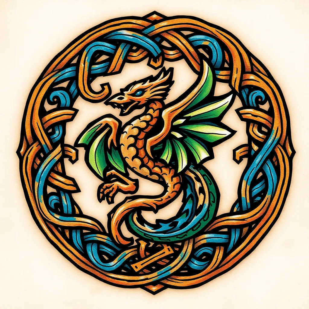Create a unique, vibrant tattoo design inspired by ancient Celtic knotwork. Incorporate swirling patterns, interlocking spirals, and intricate details. The design should feature a mythical creature, such as a dragon or phoenix, amidst the knots. Colors should be bold and contrasting, with a mix of blues, greens, and golds.