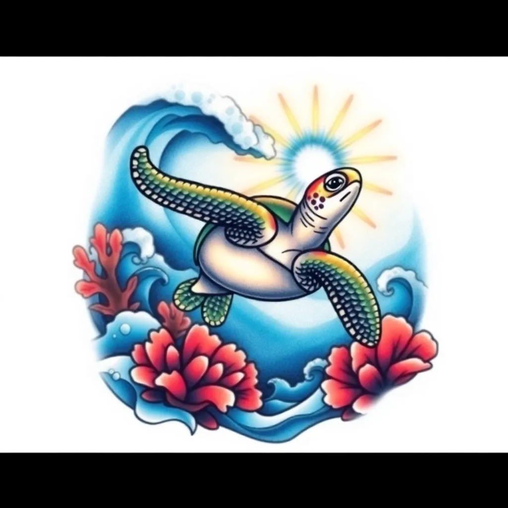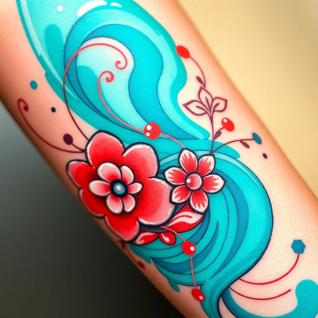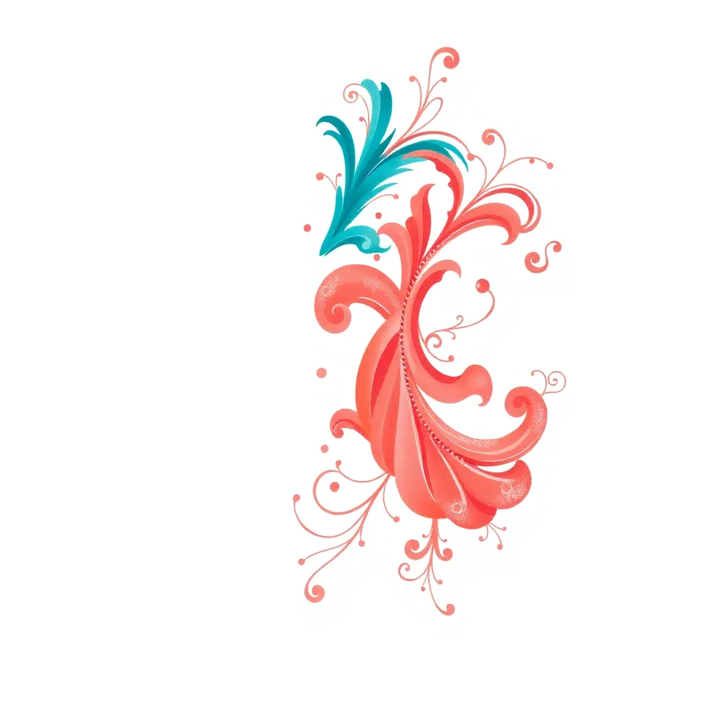Create a vibrant, abstract tattoo design featuring swirling patterns of turquoise and coral hues, with delicate florals and geometric shapes. Incorporate subtle shimmer effects and a bold, contrasting outline. The design should evoke a sense of freedom and joy, perfect for a statement piece on the forearm or calf.