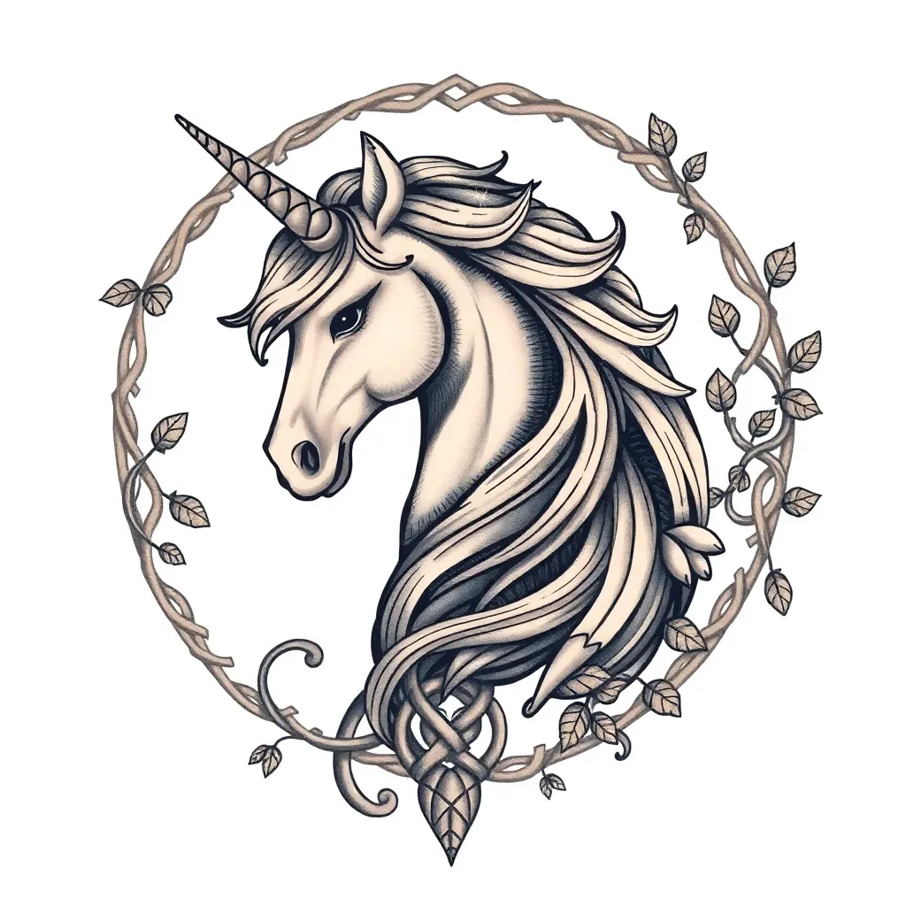 Create a stunning tattoo design inspired by the mystical world of Celtic mythology. Generate an image featuring a regal unicorn surrounded by intricate knotwork, leaves, and vines, with a subtle shimmer effect to evoke a sense of magic and wonder. Incorporate earthy tones and soft colors to create a unique piece.