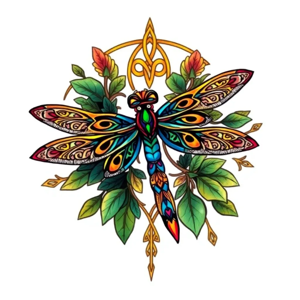 Create a stunning tattoo design inspired by the mystical world of Celtic mythology. Generate an image featuring a majestic dragonfly with intricate knotwork patterns and vibrant colors, surrounded by lush foliage and subtle Celtic symbols. Incorporate bold lines, geometric shapes, and a touch of whimsy to make it truly unique.