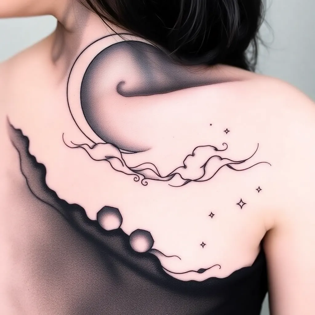Create a unique tattoo design for a fictional character, 'Luna', inspired by the mystical world of celestial bodies and the Japanese art of Kintsugi. Incorporate delicate stars, crescent moons, and wispy clouds into a flowing, abstract design that tells a story of resilience and the beauty of imperfection.
