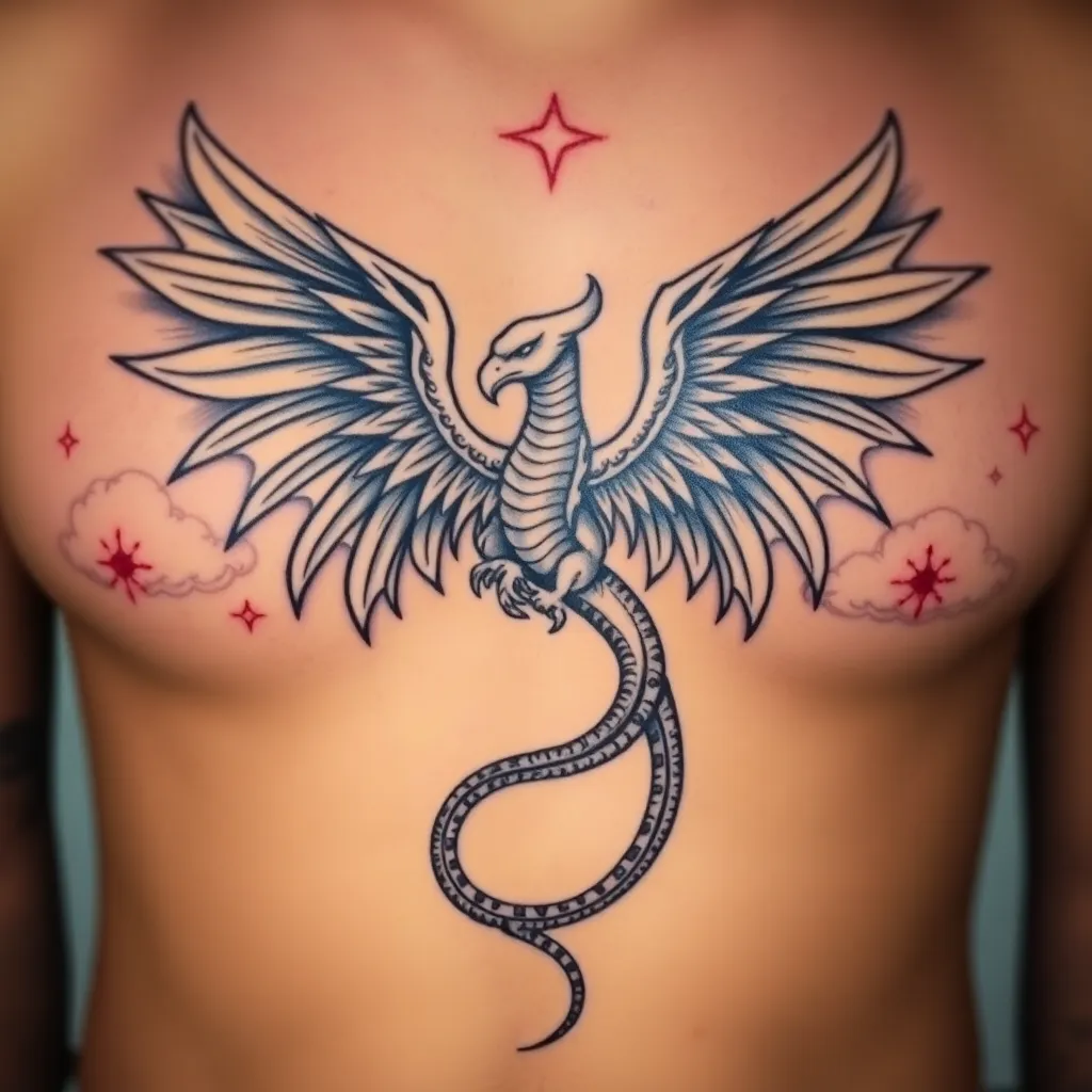 Create a stunning tattoo design inspired by ancient mythology. Combine the majestic wings of the Griffin with the serpentine tail of the Ouroboros, set against a backdrop of swirling clouds and stars. Incorporate intricate details and subtle shading to bring this mythical creature to on life the human skin.