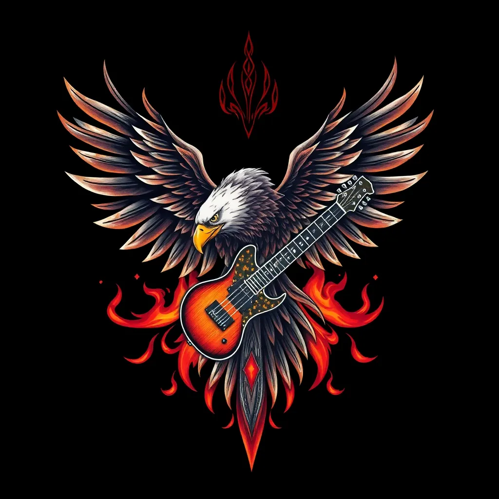 Create a stunning tattoo design for a brave warrior. The image should feature a majestic eagle soaring above a rising sun, with intricate Celtic knotwork surrounding the edges. The eagle's wings should be spread wide, with a fiery aura emanating from its body. Incorporate a subtle background texture of ancient parchment.