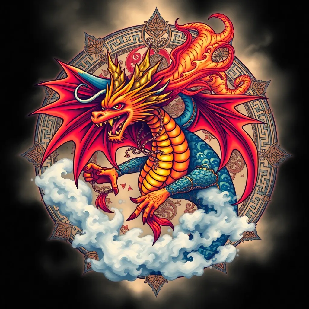 Create a vibrant, surreal tattoo design featuring a mythical creature (e.g. dragon, phoenix, mermaid) surrounded by intricate, swirling patterns and symbols from ancient cultures (e.g. Celtic, Aztec, Japanese). Incorporate bright, bold colors and bold lines. The creature should appear to be emerging from a misty, dreamlike environment.
