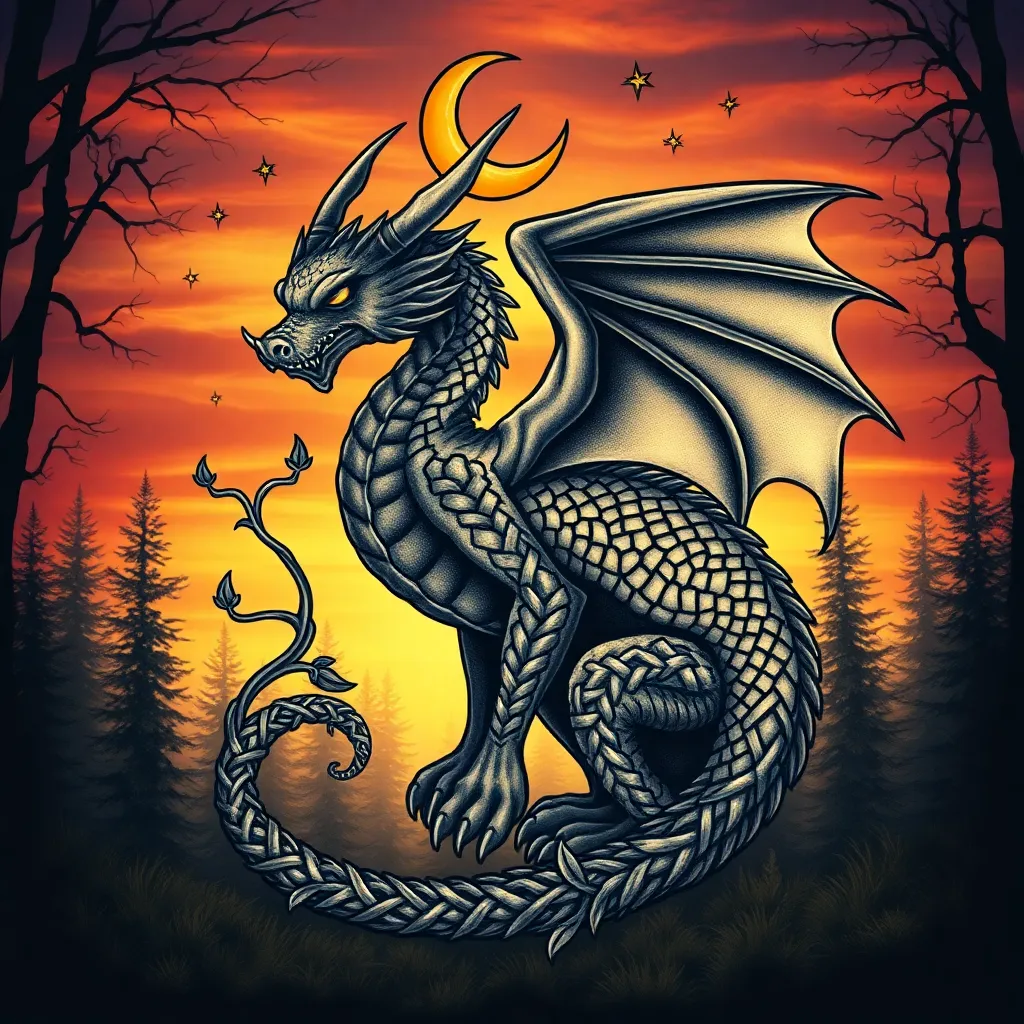 Design a tattoo of a mythical creature, a dragon, in a mystical forest setting at sunset. Incorporate Celtic knotwork and vines wrapping around the dragon's body, with a crescent moon and stars shining down. The dragon's scales should shimmer with a metallic sheen, and its eyes should glow with an inner light.
