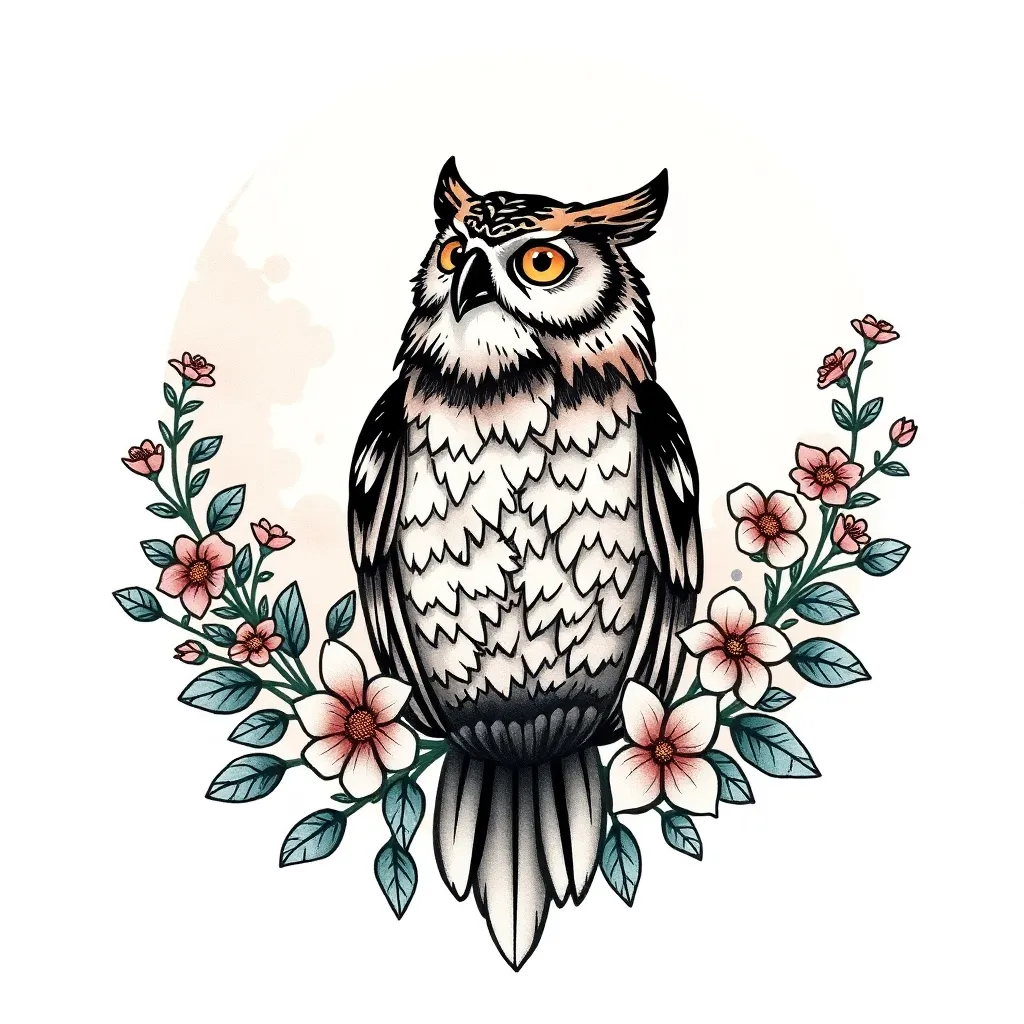 Create a stunning tattoo design for a 30-year-old free-spirited artist. Incorporate a majestic owl, surrounded by vines and flowers, with a subtle moon phase pattern in the background. The owl should be looking upwards, symbolizing wisdom and creativity. Use a mix of bold lines, watercolor textures, and pastel colors.