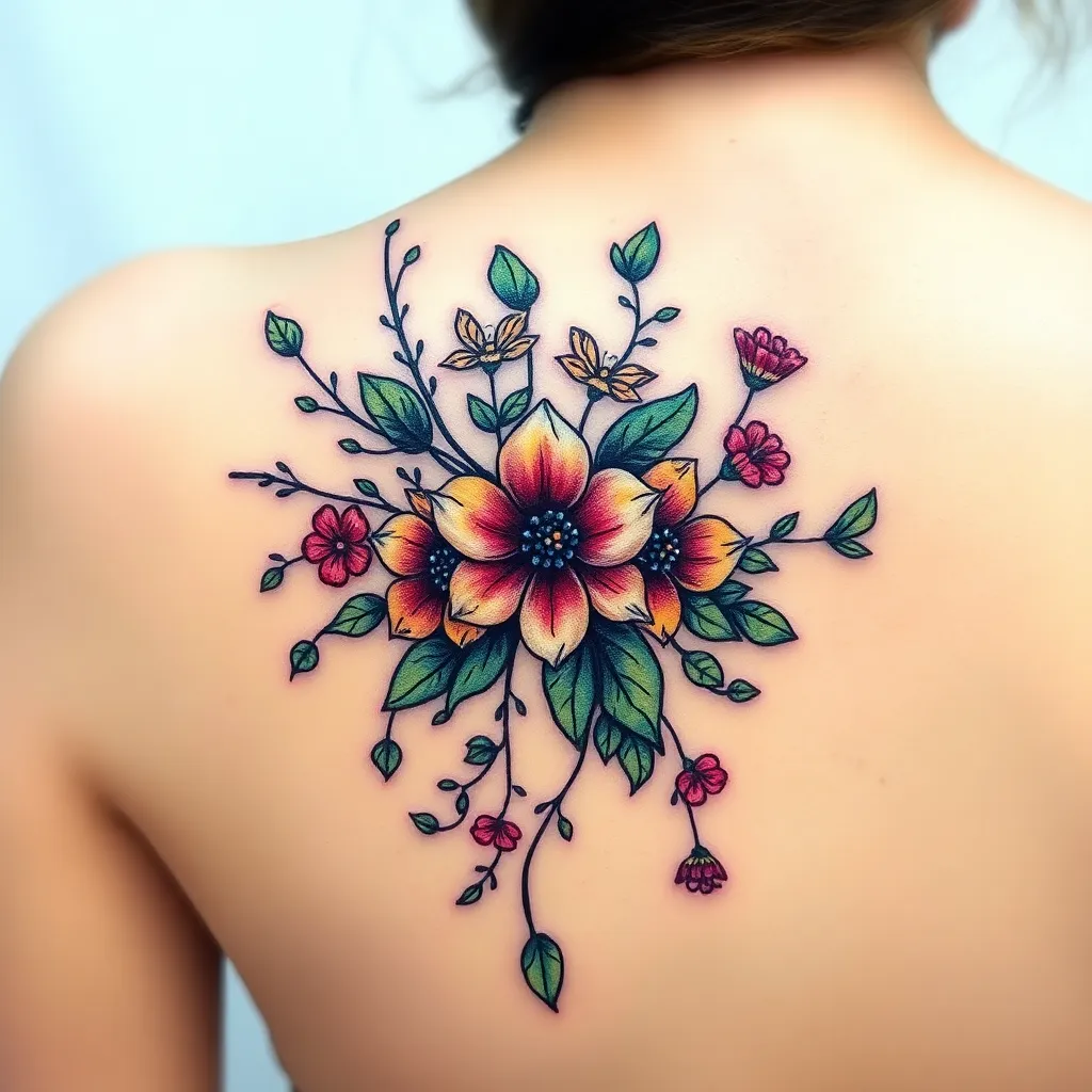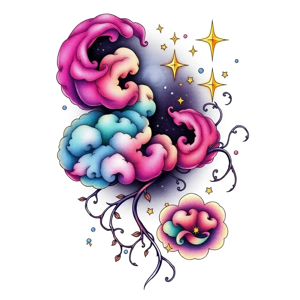 Create a unique tattoo design inspired by the mystical realm of 'Aurora's Edge'. Incorporate swirling clouds, shimmering stars, and wispy vines. The design should evoke a sense of wonder and magic. Use a combination of bold lines, delicate details, and vibrant colors to bring this ethereal world to life.