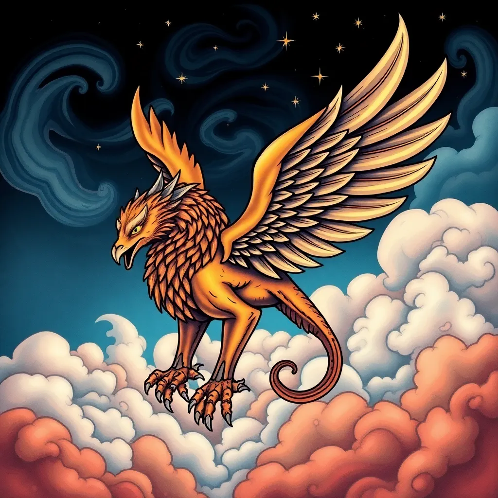 Create a stunning tattoo design inspired by ancient mythology. Generate an image featuring a majestic Griffin with intricate details and vibrant colors, set against a backdrop of swirling clouds and stars. Incorporate symbolism from Greek mythology, such as the Griffin's association with guardian angels and protection.