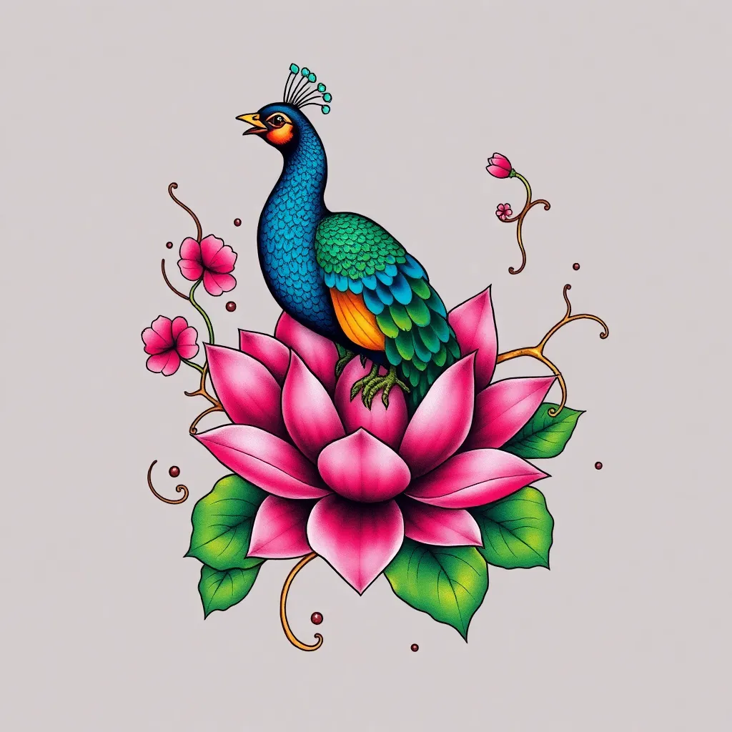 Create a stunning tattoo design for a nature-inspired enthusiast. Incorporate vibrant colors and intricate details to depict a majestic peacock perched on a blooming lotus flower, surrounded by swirling vines and leaves. The design should be bold, yet elegant, with a mix of realistic and abstract elements.