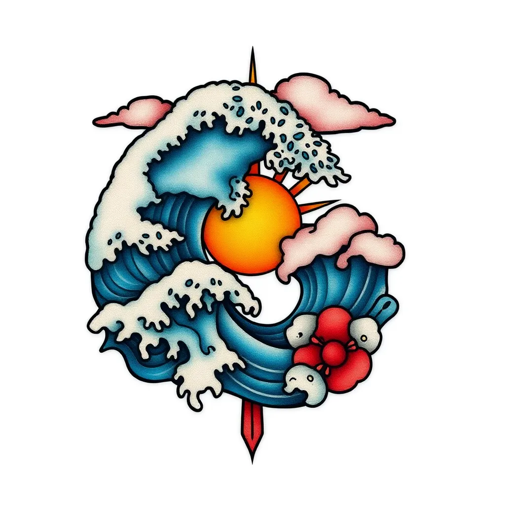 Design a unique tattoo for a free-spirited surfer chick. Incorporate elements of the ocean, sun, and clouds. Use bold, vibrant colors and intricate details. The tattoo should a resemble stylized wave, with a sun bursting through the clouds in the center. Add some subtle texture and shading to give it a 3D effect.