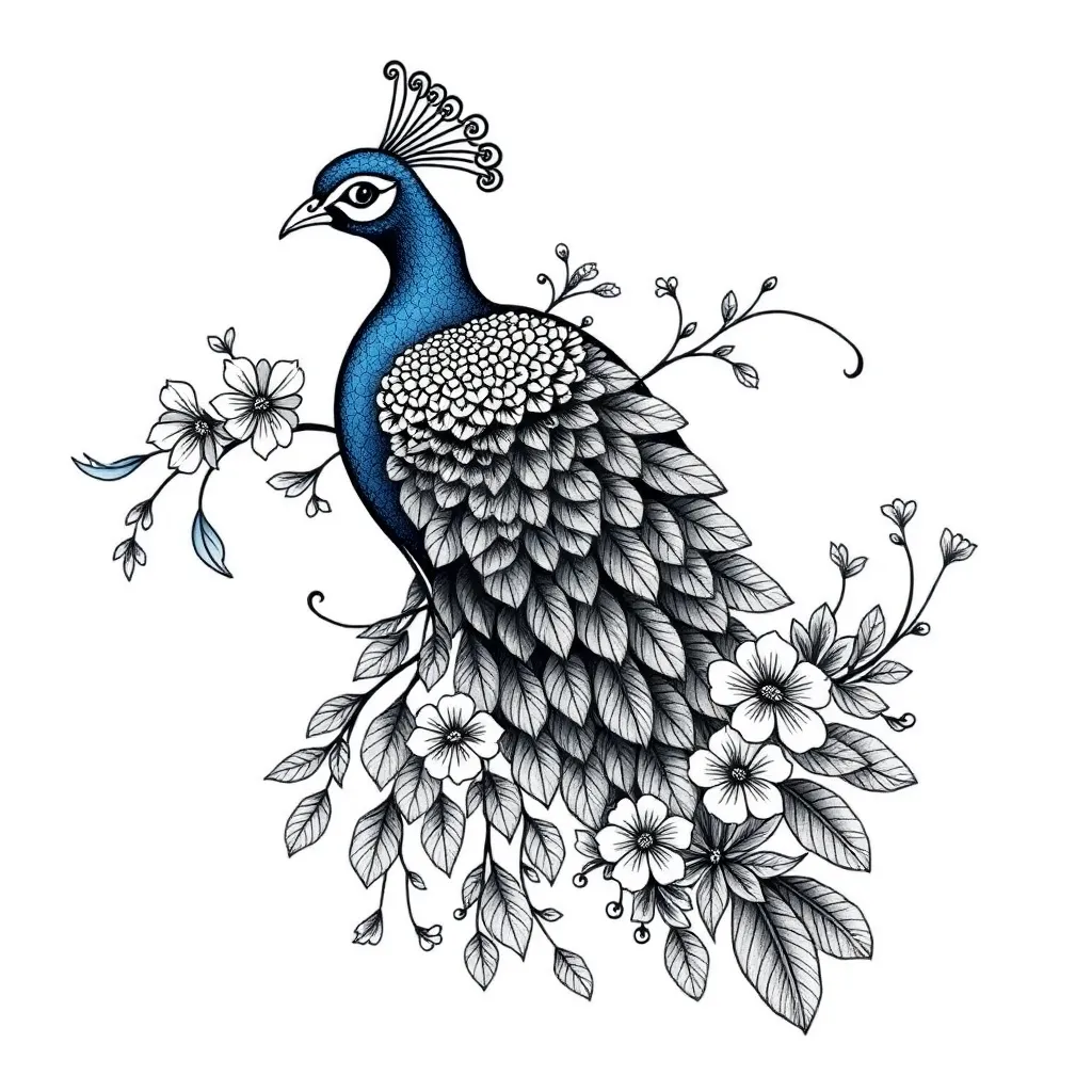 Create a stunning tattoo design for a free-spirited artist. Incorporate a majestic peacock with intricate feathers, surrounded by vines and flowers, and a subtle crescent moon symbol on the shoulder blade. The design should exude elegance, whimsy, and a touch of mysticism, blending organic and celestial elements.