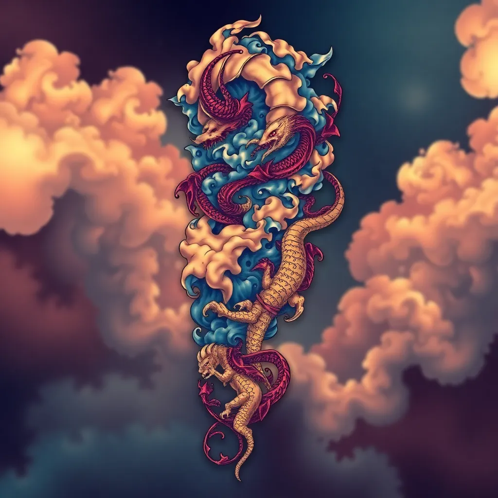 Create a stunning tattoo design for a fantasy-themed sleeve. Incorporate swirling clouds, mythical creatures, and ancient runes. Use a bold, vibrant color palette with shades of indigo, gold, and crimson. The design should be intricate, yet cohesive, with a sense of movement and energy. Generate an AI image that's ready for ink!