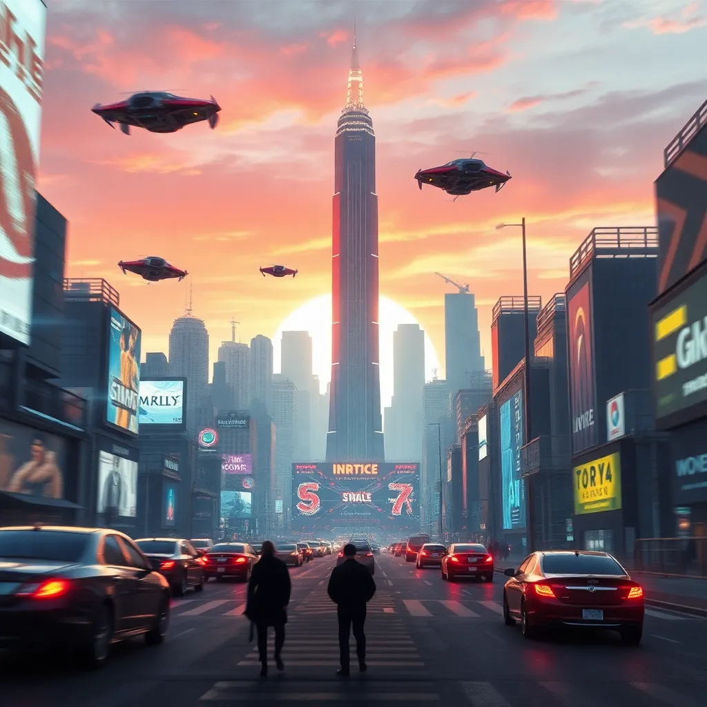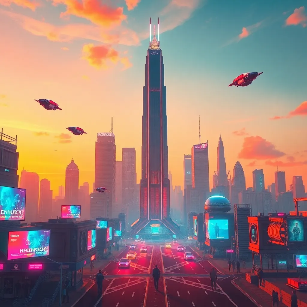 Create a futuristic cityscape at sunset with a towering skyscraper in the center, surrounded by flying cars and holographic advertisements. Incorporate a sense of movement and energy with blurred lights and a vibrant color palette. Include a few people walking on the street, with a sense of wonder and excitement.