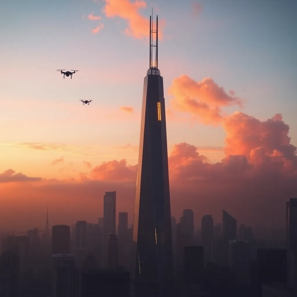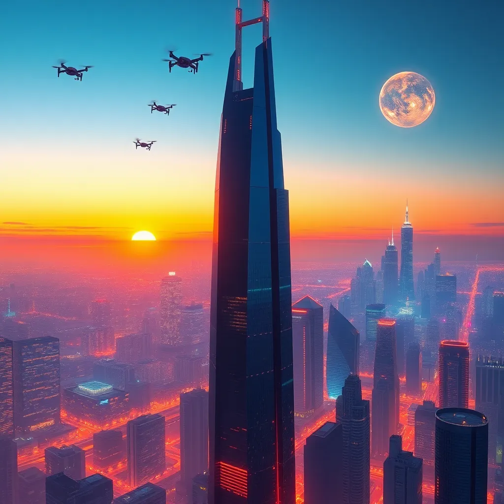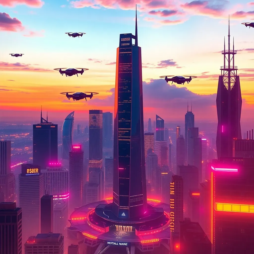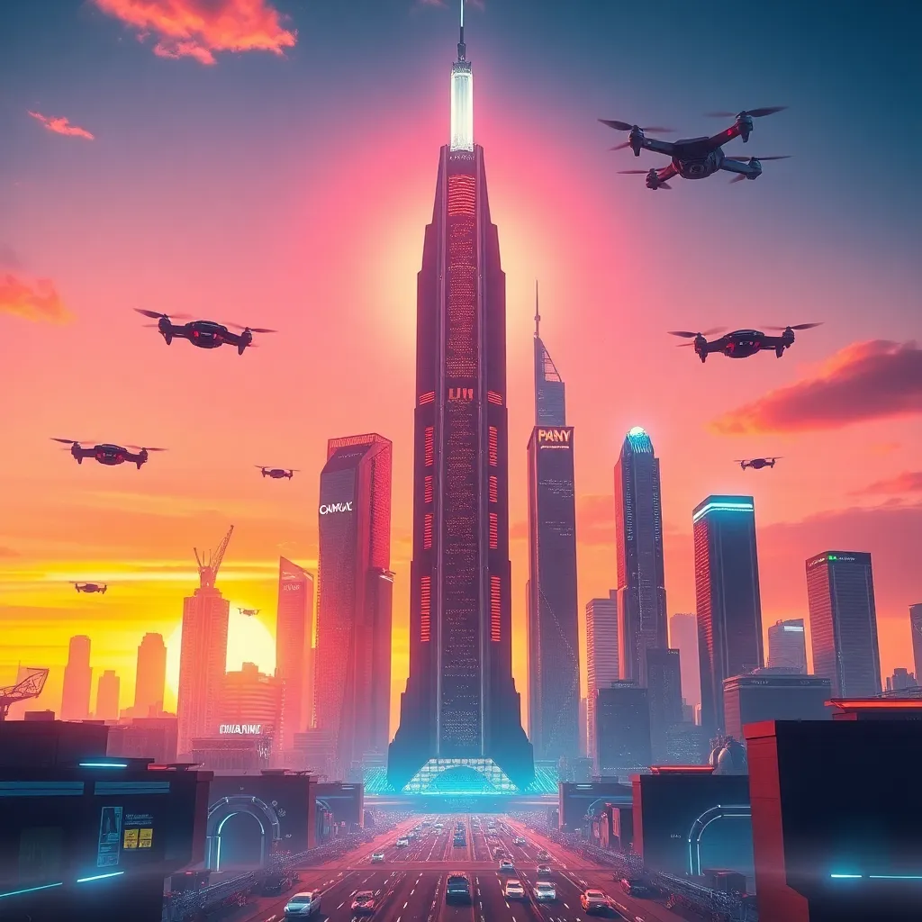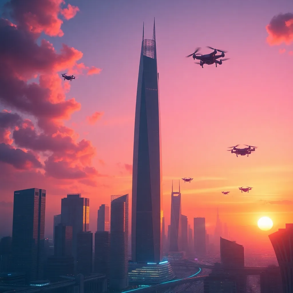 Create a futuristic cityscape at sunset with a prominent skyscraper, neon-lit streets, and a flock of flying drones hovering above. Incorporate a vibrant orange and pink color scheme, with subtle LED lights and a sense of movement. The atmosphere should be dynamic and energetic, as if the city is alive.