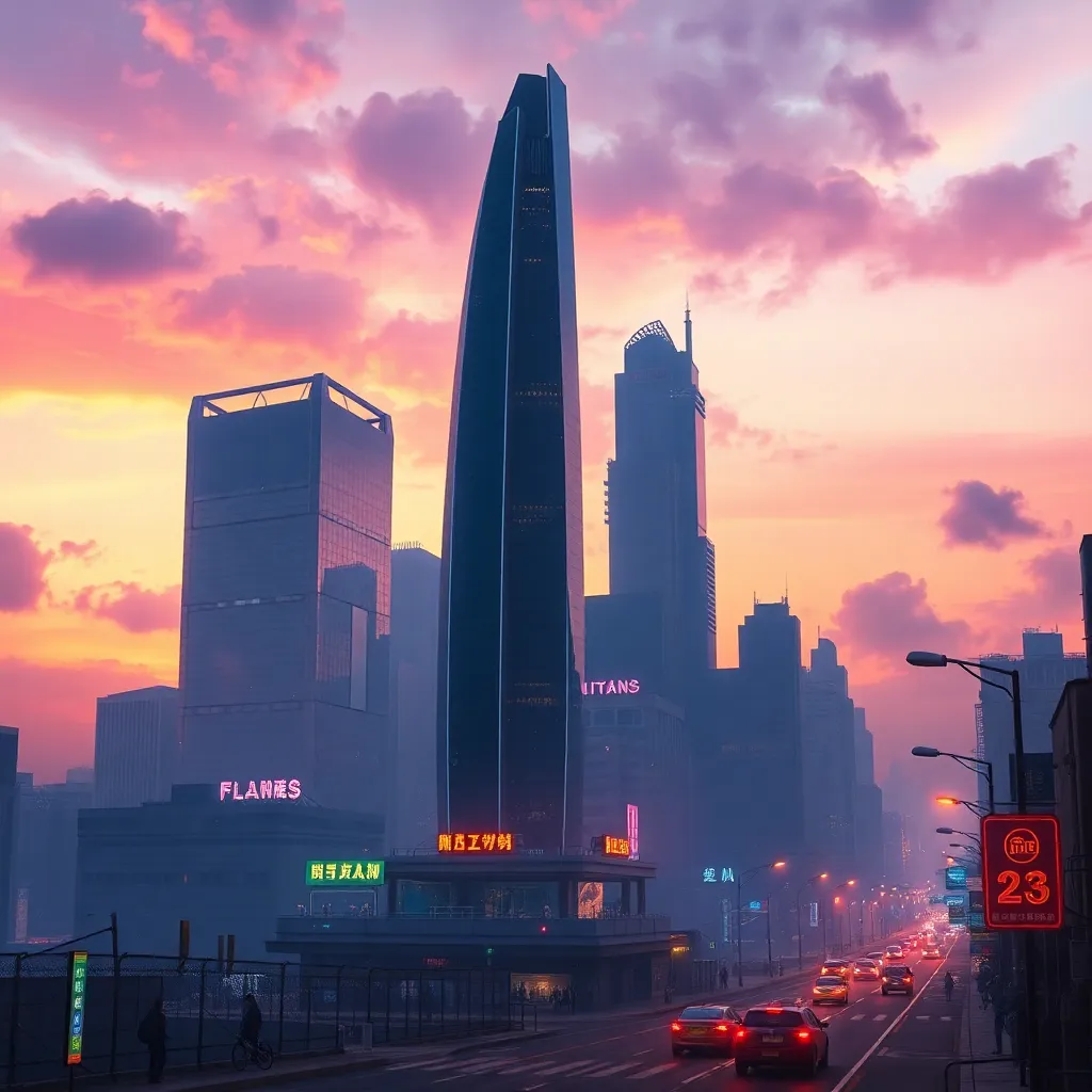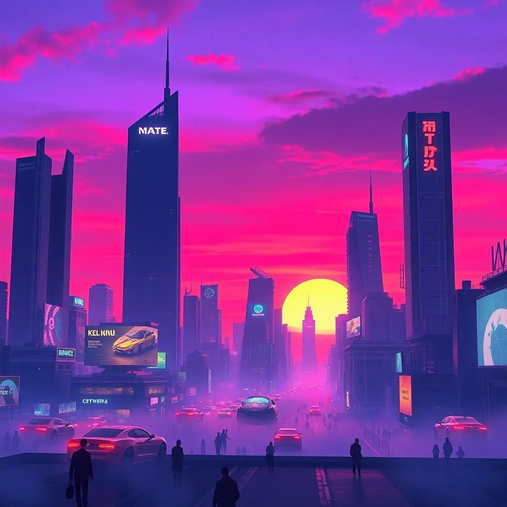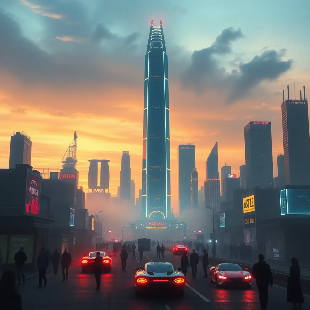 Create a futuristic cityscape at sunset with a sleek skyscraper in the foreground, surrounded by a haze of purple and orange clouds. Incorporate neon lights and a busy street scene with people and vehicles moving in the background. Blend realistic and stylized elements for a captivating and dreamy atmosphere.