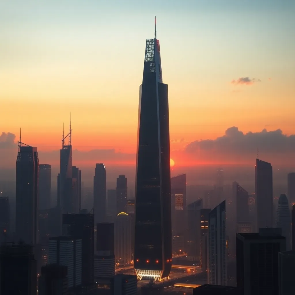 Create a futuristic cityscape at sunset. Imagine a towering skyscraper with a sleek, neon-lit façade. The sky is a warm orange with hues of pink and purple. A few wispy clouds are scattered across the horizon. The city streets are bustling with futuristic vehicles and pedestrians. Make it visually striking!