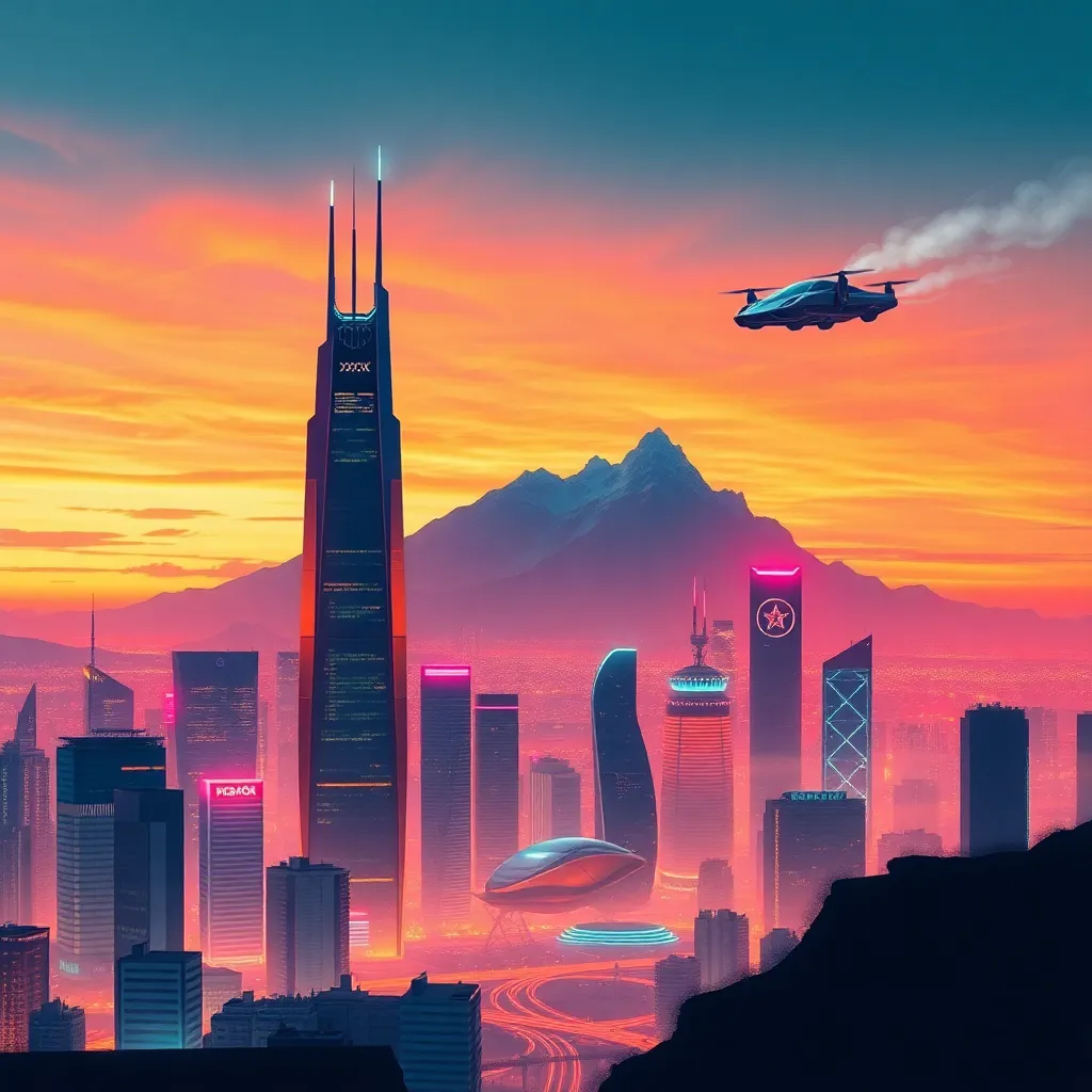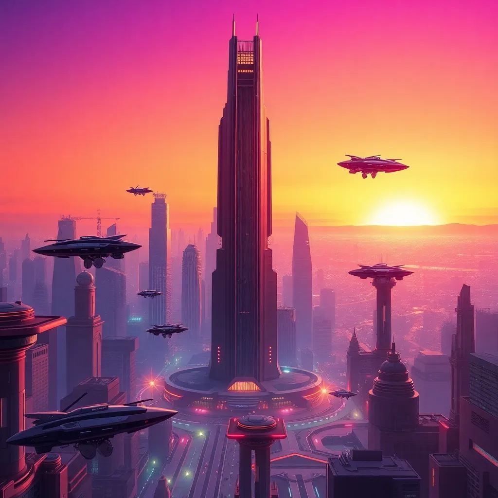 Create a futuristic cityscape at sunset with a glowing skyscraper in the center, surrounded by flying cars and a vibrant, neon-lit cityscape. Incorporate a subtle sense of movement and energy, with a mix of sleek, modern architecture and organic, natural elements. Use a bold, contrasting color palette.