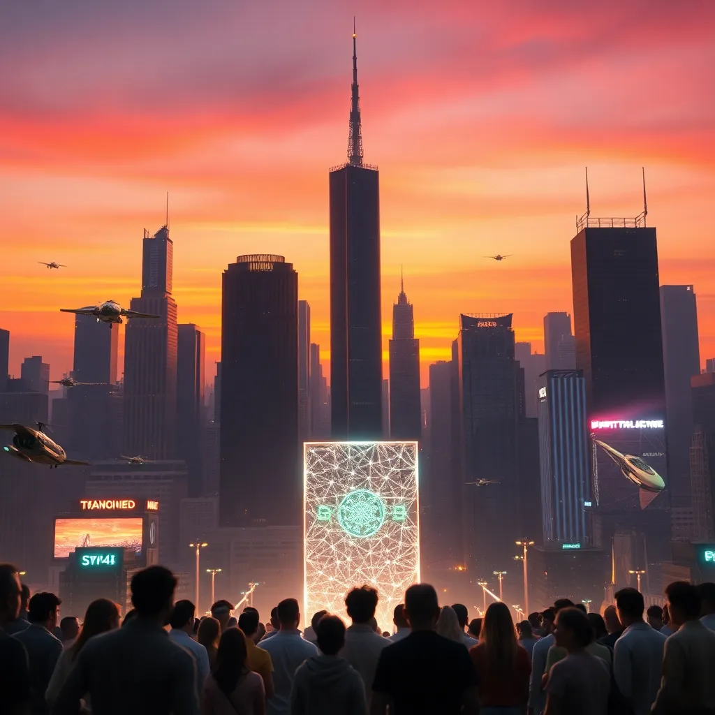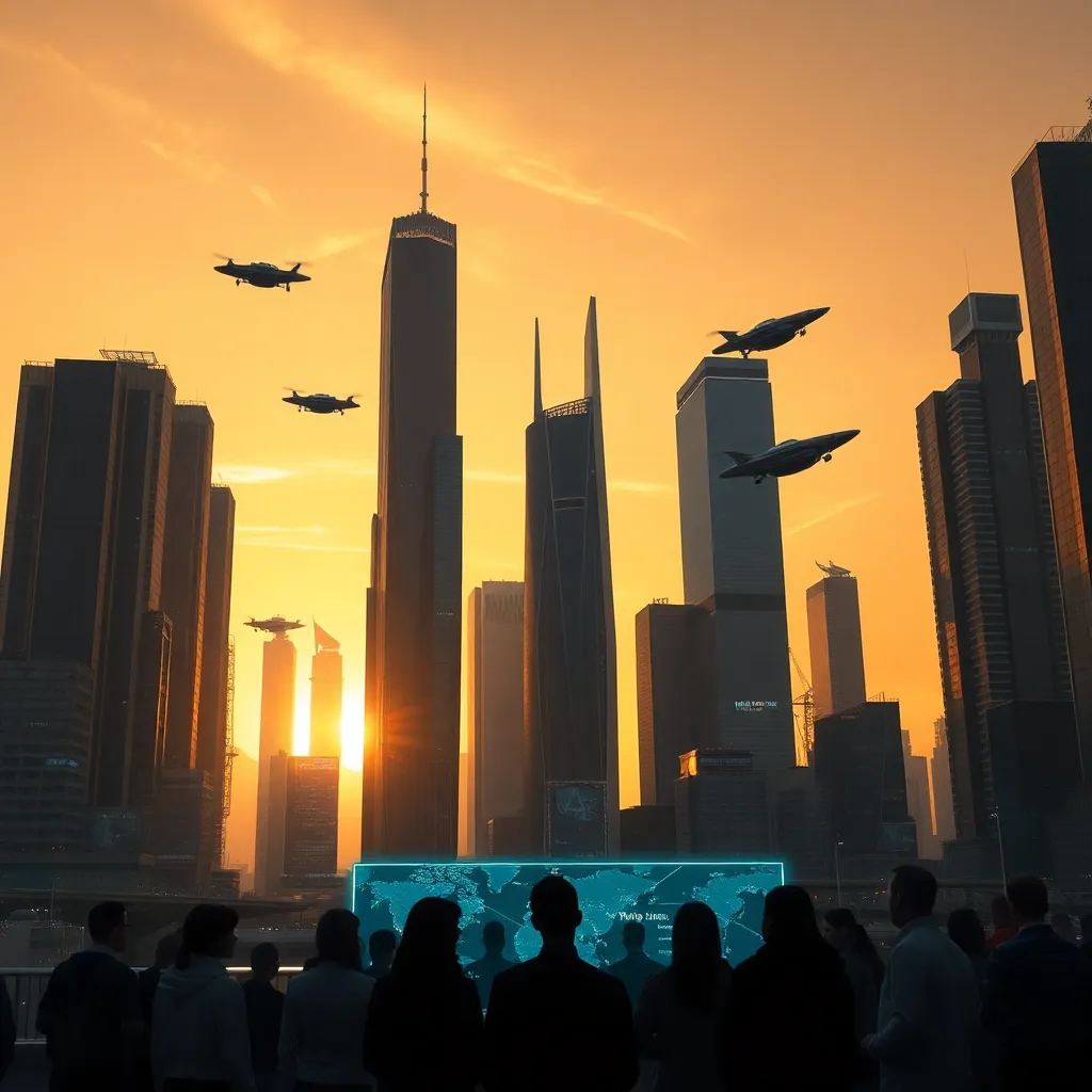 Create a futuristic cityscape at sunset, with towering skyscrapers and flying cars zipping by. The sky is a warm orange color with pink and purple hues. In the foreground, a group of people are gathered around a holographic display, gazing up in wonder. Incorporate neon lights and a sense of movement.