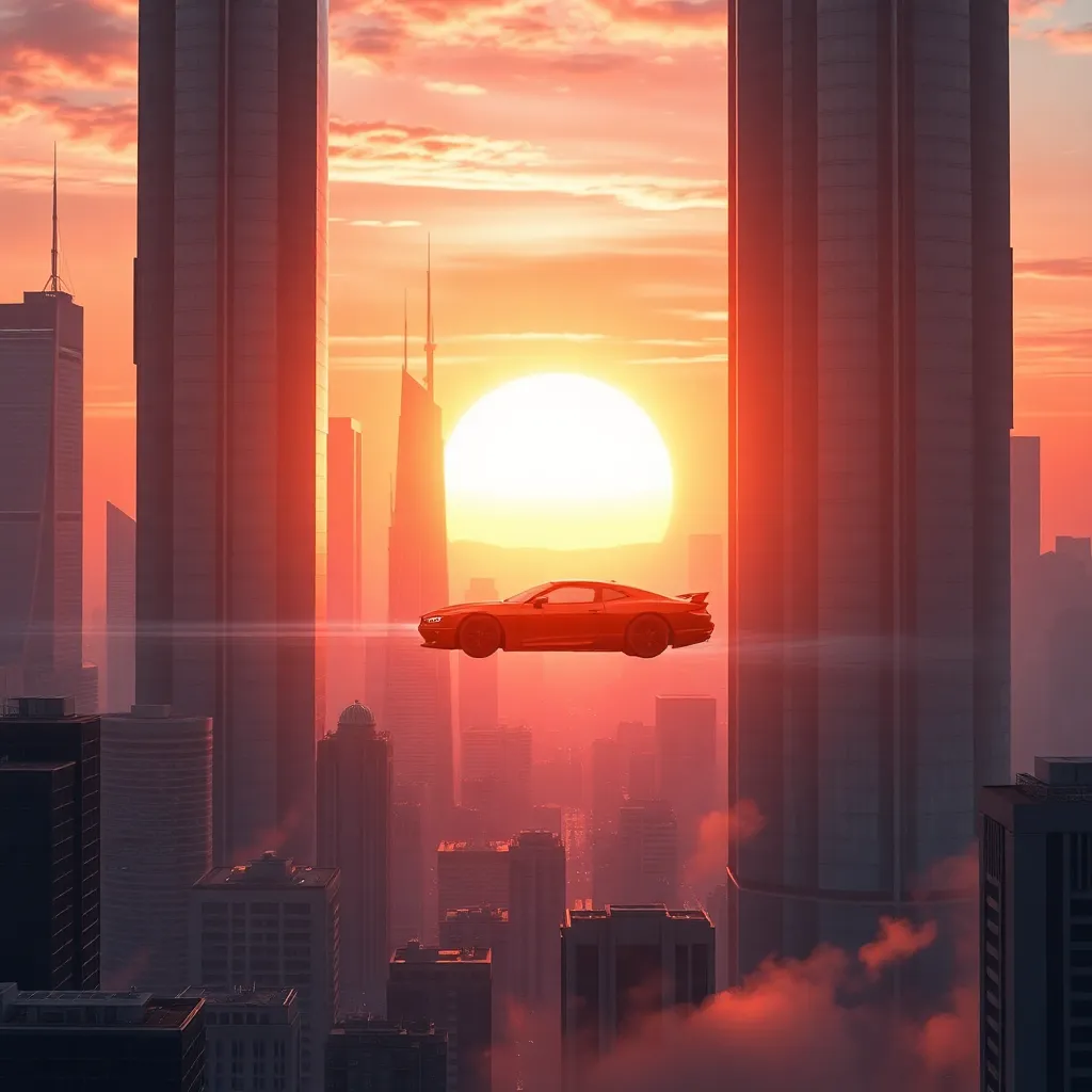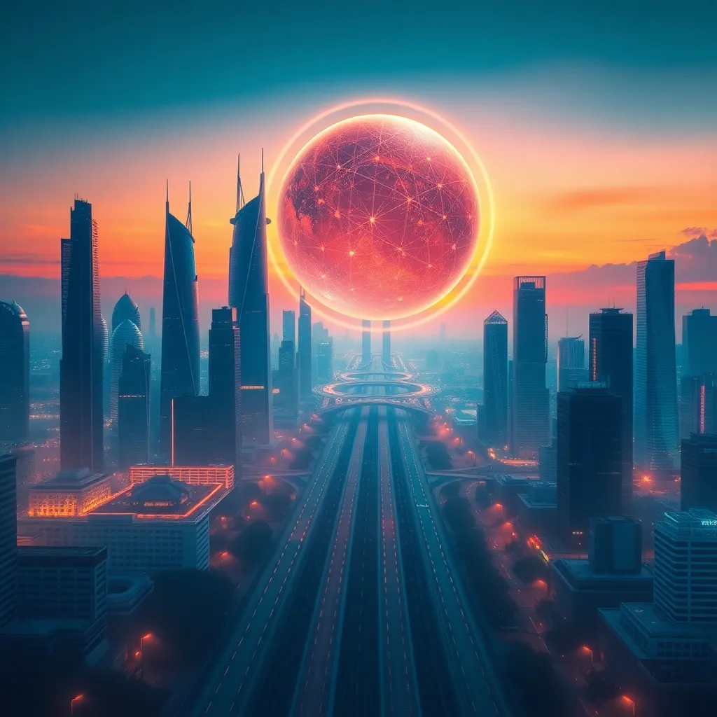 Create a futuristic cityscape at sunset with towering skyscrapers, sleek roads, and a vibrant atmosphere. Incorporate a large, glowing orb hovering above the city, surrounded by a halo of light. The color palette should be a mix of deep blues, oranges, and purples, with a sense of movement and energy.